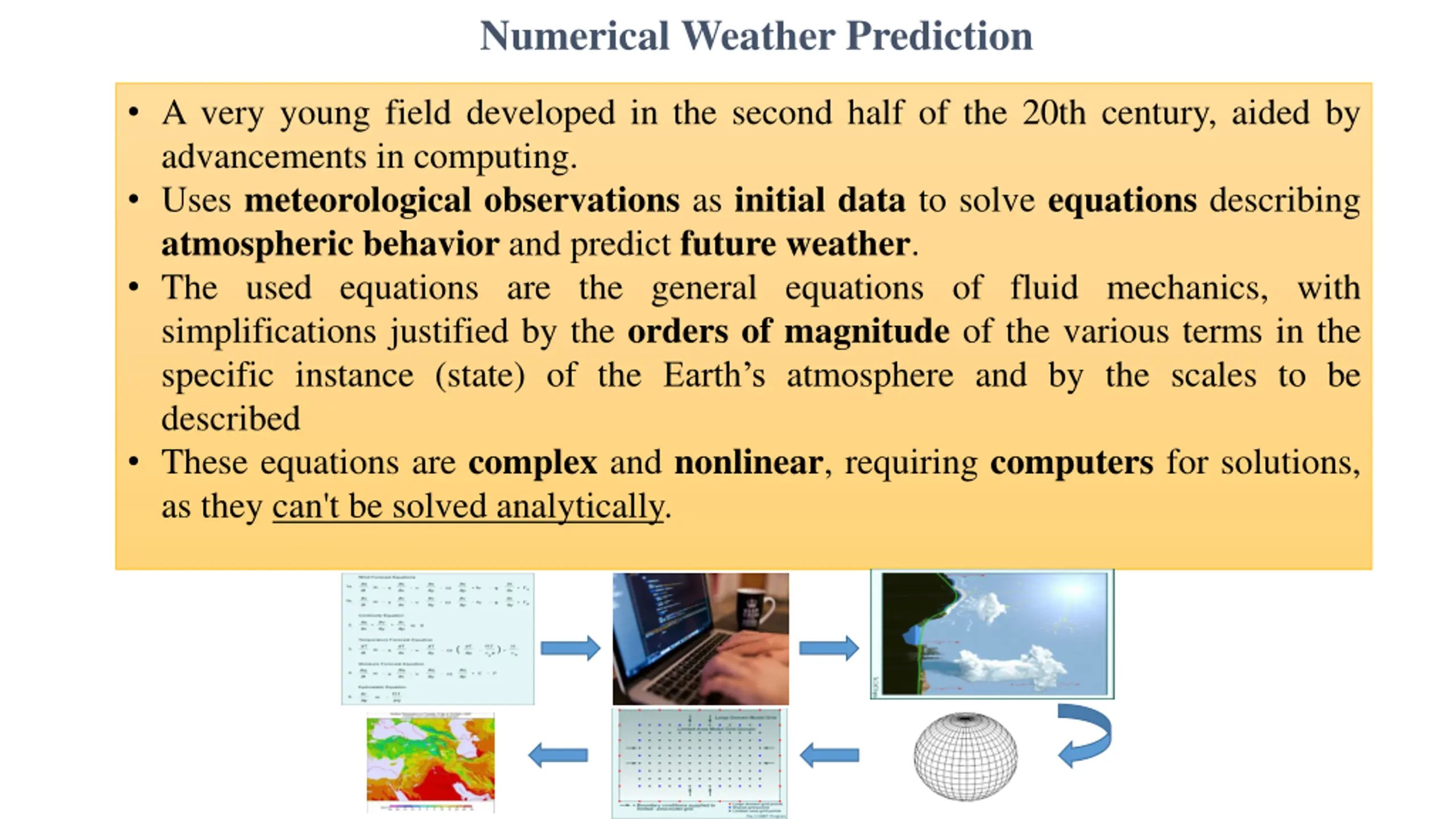 Numerical Weather Prediction A very young field developed in the second half of the 20th century, aided by advancements in computing. Uses meteorological observations as initial data to solve equations describing atmospheric behavior and predict future weather. The used equations are the general equations of fluid mechanics, with simplifications justified by the orders of magnitude of the various terms in the specific instance (state) of the Earth s atmosphere and by the scales to be described These equations are complex and nonlinear, requiring computers for solutions, as they can't be solved analytically.