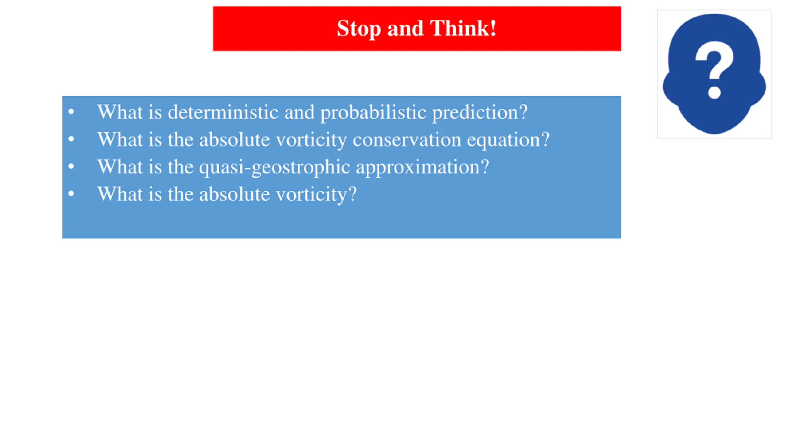 Stop and Think! What is deterministic and probabilistic prediction? What is the absolute vorticity conservation equation? What is the quasi-geostrophic approximation? What is the absolute vorticity?