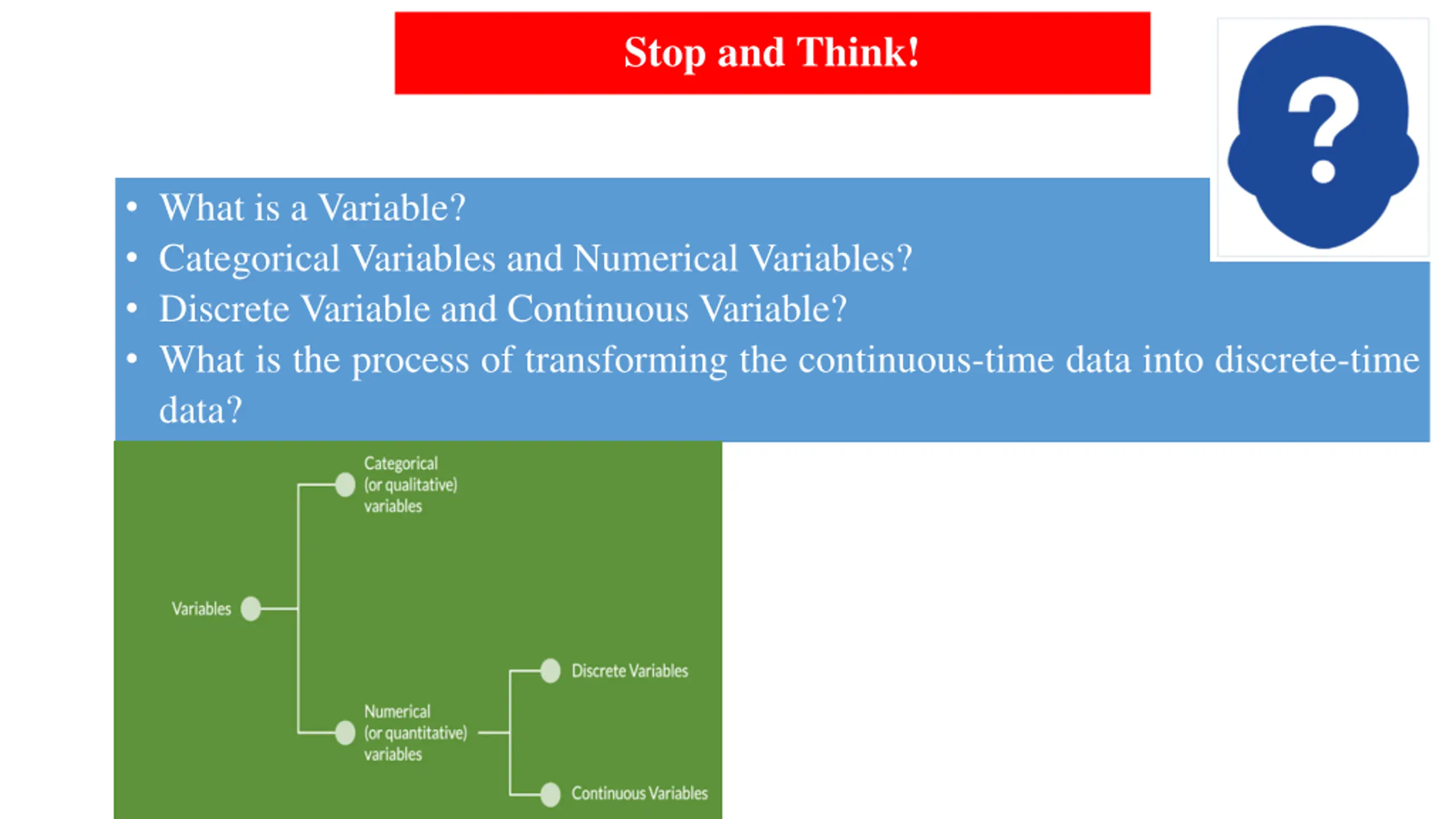 Stop and Think! What is a Variable? Categorical Variables and Numerical Variables? Discrete Variable and Continuous Variable? What is the process of transforming the continuous-time data into discrete-time data?
