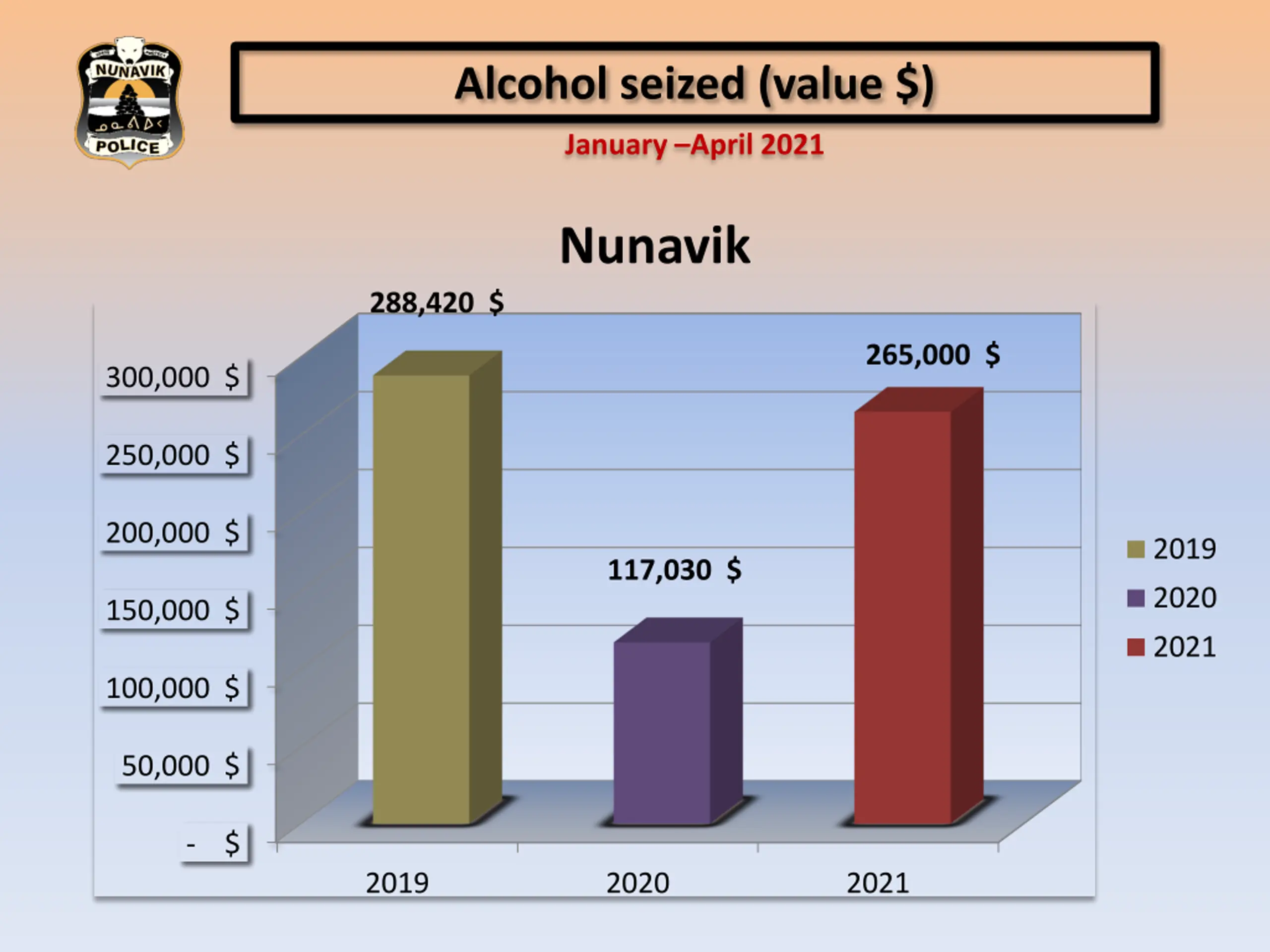 Alcohol seized (value $) January April 2021 Nunavik 288,420 $ 265,000 $ 300,000 $ 250,000 $ 200,000 $ 2019 117,030 $ 2020 150,000 $ 2021 100,000 $ 50,000 $ - $ 2019 2020 2021