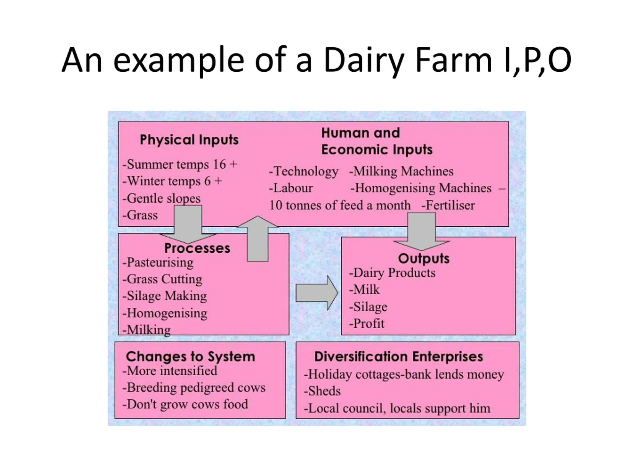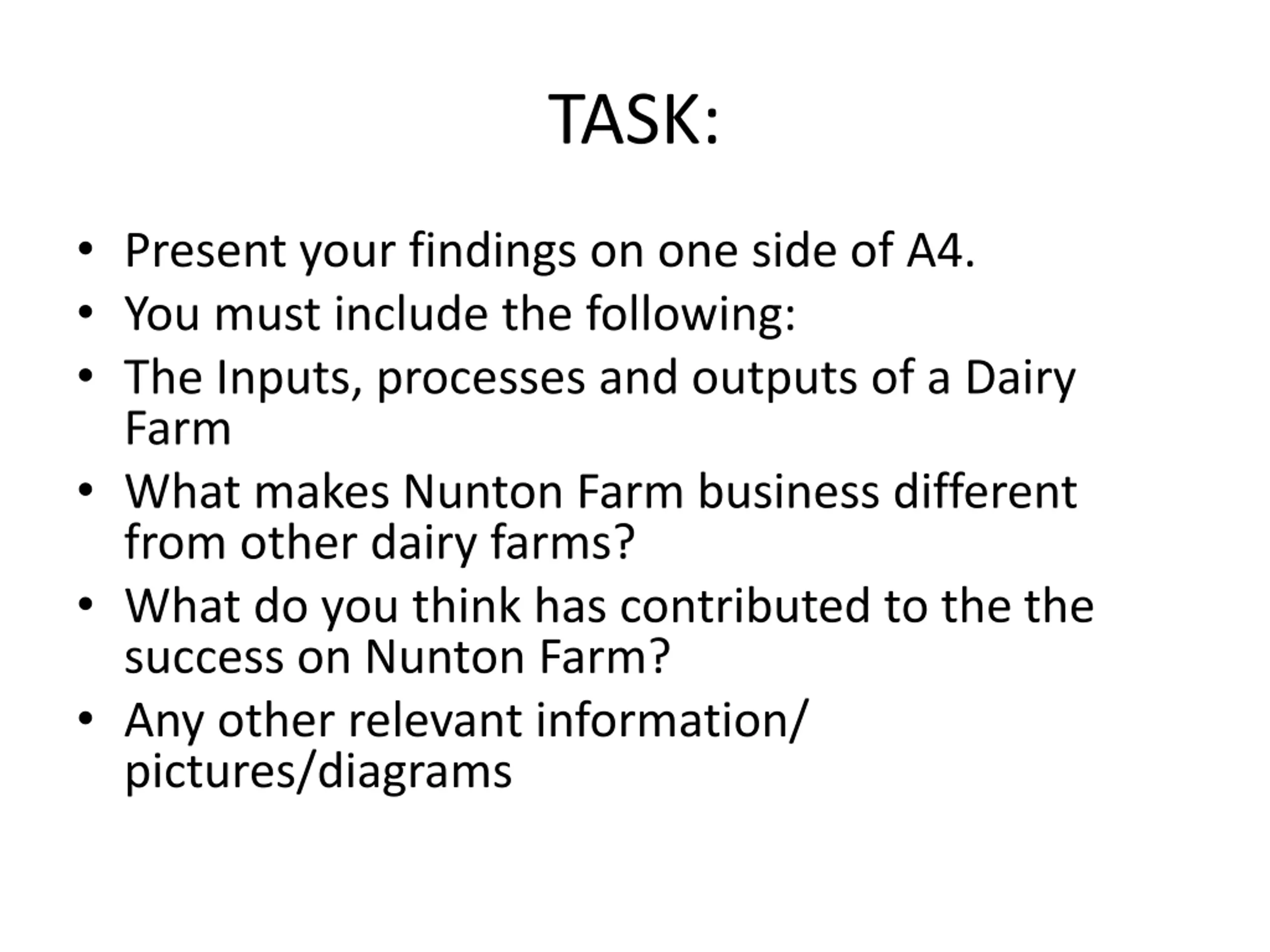 TASK: Present your findings on one side of A4. You must include the following: The Inputs, processes and outputs of a Dairy Farm What makes Nunton Farm business different from other dairy farms? What do you think has contributed to the the success on Nunton Farm? Any other relevant information/ pictures/diagrams