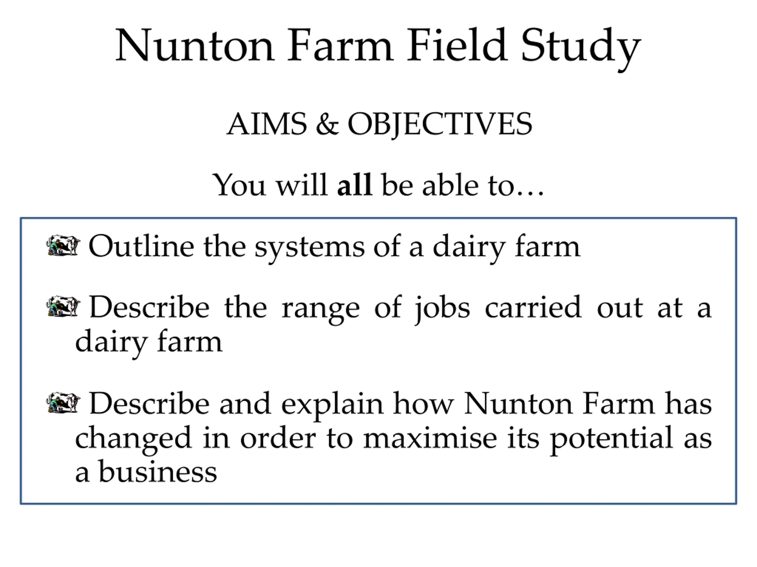 Nunton Farm Field Study AIMS & OBJECTIVES You will all be able to Outline the systems of a dairy farm Describe the range of jobs carried out at a dairy farm Describe and explain how Nunton Farm has changed in order to maximise its potential as a business