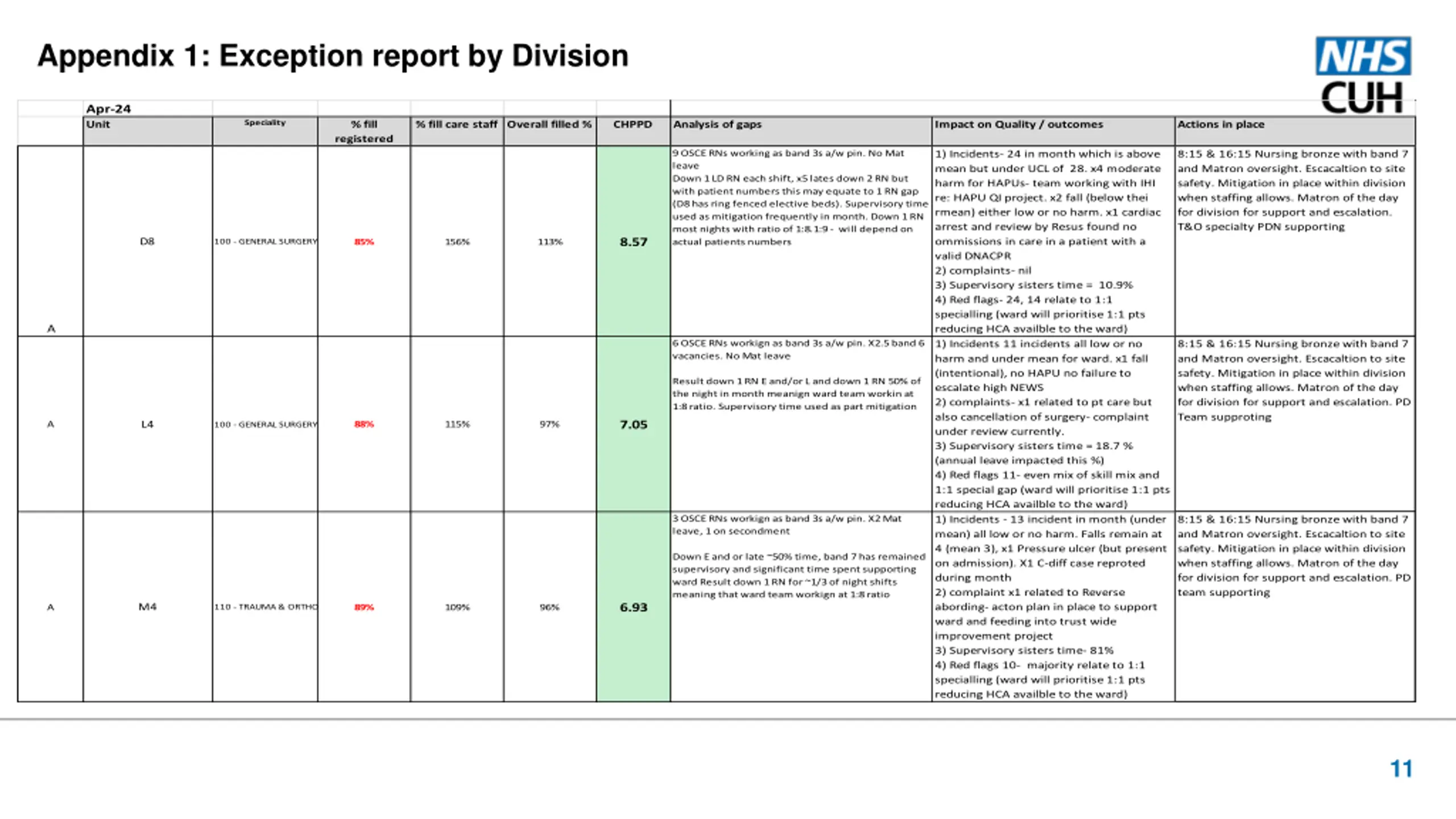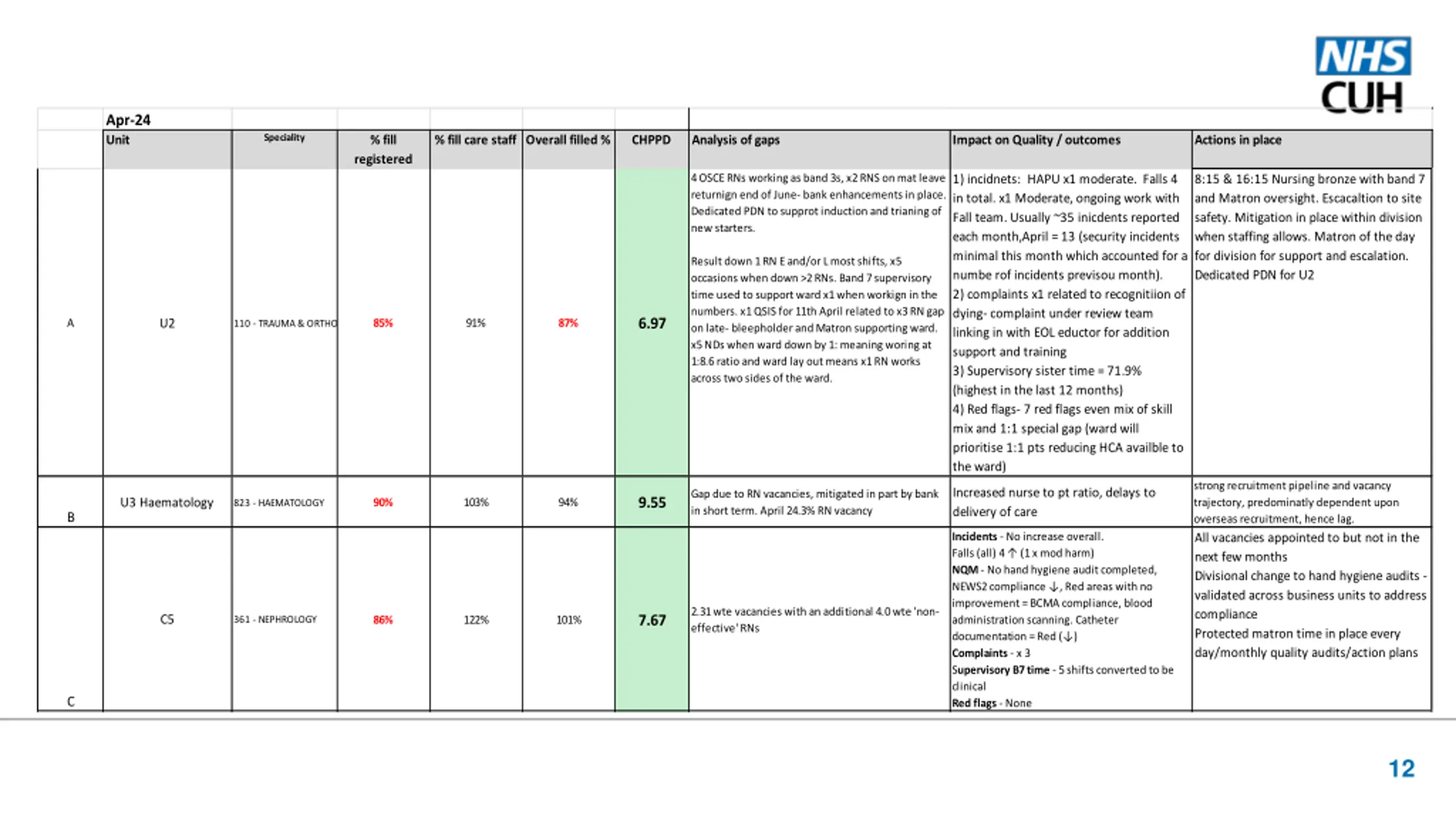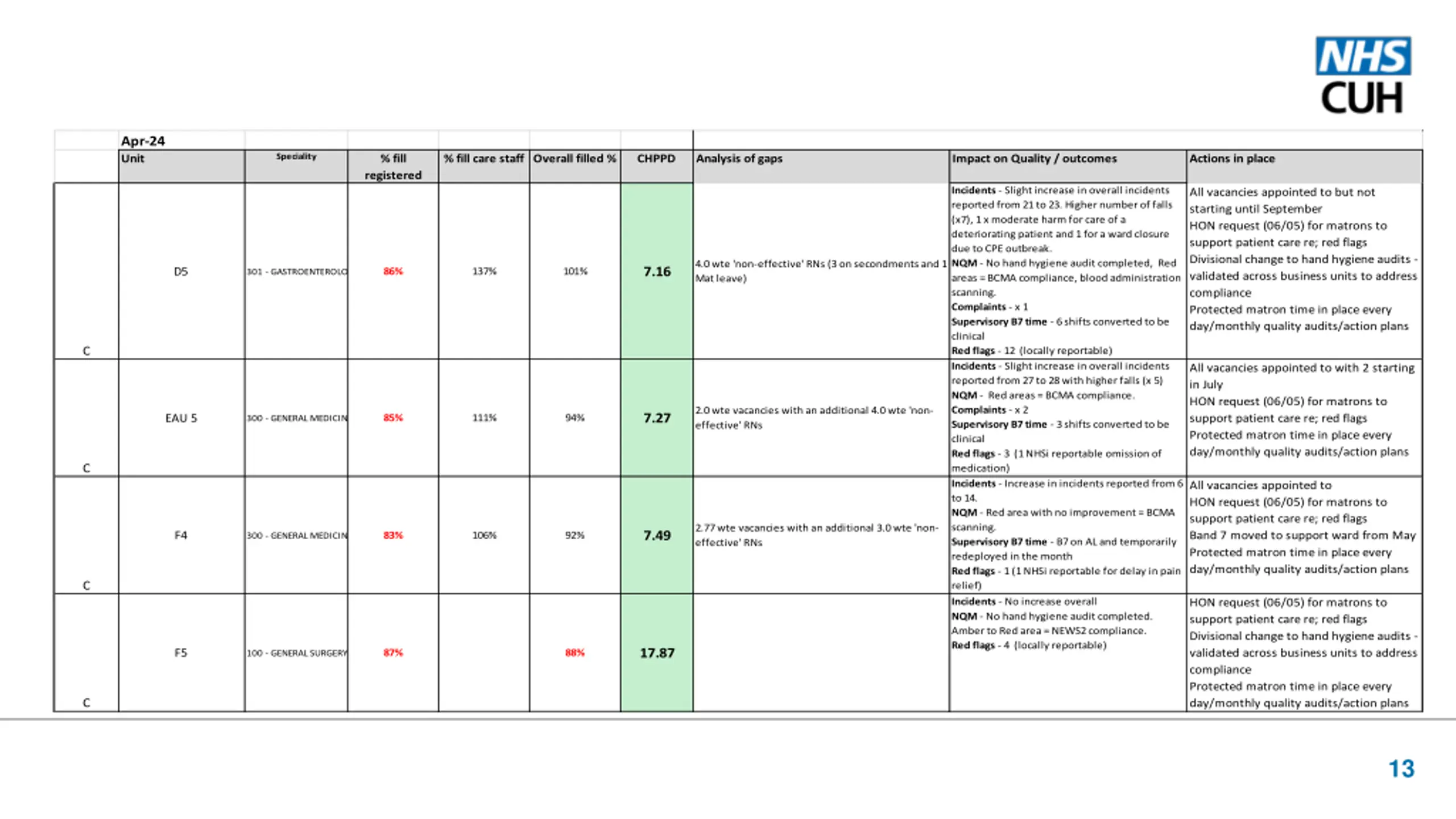 Apr-24 Unit Speciality % fill % fill care staff Overall filled % CHPPD Analysis of gaps Impact on Quality / outcomes Actions in place registered Incidents - Slight increase in overall incidents reported from 21 to 23. Higher number of falls (x7), 1 x moderate harm for care of a deteriorating patient and 1 for a ward closure due to CPE outbreak. NQM - No hand hygiene audit completed, Red areas = BCMA compliance, blood administration scanning. Complaints - x 1 Supervisory B7 time - 6 shifts converted to be clinical Red flags - 12 (locally reportable) Incidents - Slight increase in overall incidents reported from 27 to 28 with higher falls (x 5) NQM - Red areas = BCMA compliance. Complaints - x 2 Supervisory B7 time - 3 shifts converted to be clinical Red flags - 3 (1 NHSi reportable omission of medication) Incidents - Increase in incidents reported from 6 to 14. NQM - Red area with no improvement = BCMA scanning. Supervisory B7 time - B7 on AL and temporarily redeployed in the month Red flags - 1 (1 NHSi reportable for delay in pain relief) Incidents - No increase overall NQM - No hand hygiene audit completed. Amber to Red area = NEWS2 compliance. Red flags - 4 (locally reportable) All vacancies appointed to but not starting until September HON request (06/05) for matrons to support patient care re; red flags Divisional change to hand hygiene audits - validated across business units to address compliance Protected matron time in place every day/monthly quality audits/action plans 4.0 wte 'non-effective' RNs (3 on secondments and 1 Mat leave) 7.16 D5 86% 137% 101% 301 - GASTROENTEROLOGY C All vacancies appointed to with 2 starting in July HON request (06/05) for matrons to support patient care re; red flags Protected matron time in place every day/monthly quality audits/action plans 2.0 wte vacancies with an additional 4.0 wte 'non- effective' RNs 7.27 EAU 5 85% 111% 94% 300 - GENERAL MEDICINE C All vacancies appointed to HON request (06/05) for matrons to support patient care re; red flags Band 7 moved to support ward from May Protected matron time in place every day/monthly quality audits/action plans 2.77 wte vacancies with an additional 3.0 wte 'non- effective' RNs 7.49 F4 83% 106% 92% 300 - GENERAL MEDICINE C HON request (06/05) for matrons to support patient care re; red flags Divisional change to hand hygiene audits - validated across business units to address compliance Protected matron time in place every day/monthly quality audits/action plans 17.87 F5 87% 88% 100 - GENERAL SURGERY C 13