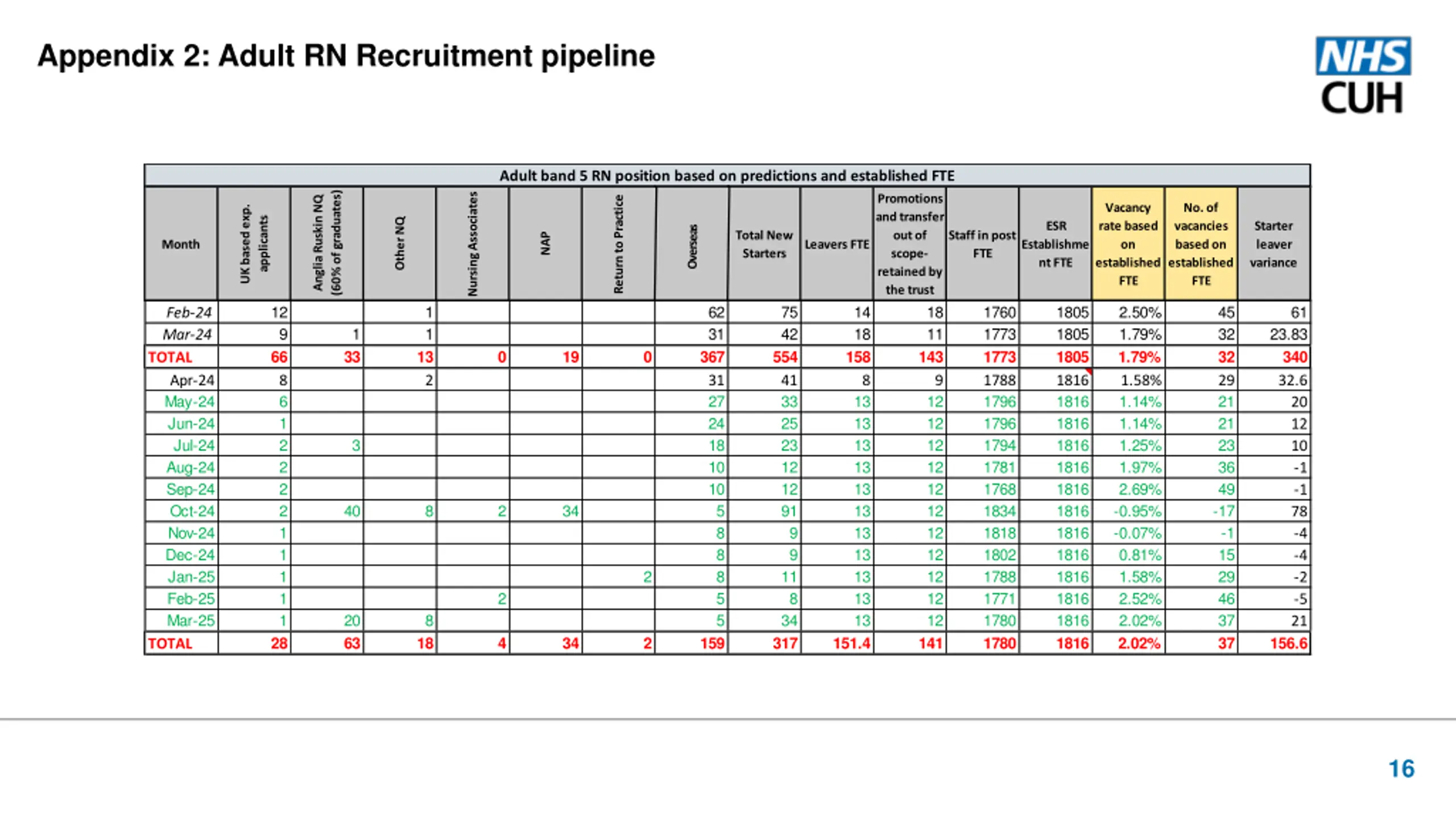 Appendix 2: Adult RN Recruitment pipeline Adult band 5 RN position based on predictions and established FTE (60% of graduates) Nursing Associates Anglia Ruskin NQ Promotions and transfer out of scope- retained by the trust Return to Practice UK based exp. Vacancy rate based on established FTE No. of vacancies based on established FTE applicants Other NQ ESR Starter leaver variance Overseas Total New Starters Staff in post FTE NAP Month Leavers FTE Establishme nt FTE 12 9 66 8 6 1 2 2 2 2 1 1 1 1 1 28 1 1 62 31 367 31 27 24 18 10 10 75 42 554 41 33 25 23 12 12 91 14 18 158 18 11 143 1760 1773 1773 1788 1796 1796 1794 1781 1768 1834 1818 1802 1788 1771 1780 1780 1805 1805 1805 1816 1816 1816 1816 1816 1816 1816 1816 1816 1816 1816 1816 1816 2.50% 1.79% 1.79% 1.58% 1.14% 1.14% 1.25% 1.97% 2.69% -0.95% -0.07% 0.81% 1.58% 2.52% 2.02% 2.02% 45 32 32 29 21 21 23 36 49 -17 -1 15 29 46 37 37 61 Feb-24 Mar-24 TOTAL Apr-24 May-24 Jun-24 Jul-24 Aug-24 Sep-24 Oct-24 Nov-24 Dec-24 Jan-25 Feb-25 Mar-25 TOTAL 1 23.83 340 32.6 33 13 2 0 19 0 8 9 13 13 13 13 13 13 13 13 13 13 13 12 12 12 12 12 12 12 12 12 12 12 141 20 12 10 -1 -1 78 -4 -4 -2 -5 21 3 40 8 2 34 5 8 8 8 5 5 9 9 2 11 8 34 317 2 20 63 8 18 4 34 2 159 151.4 156.6 16