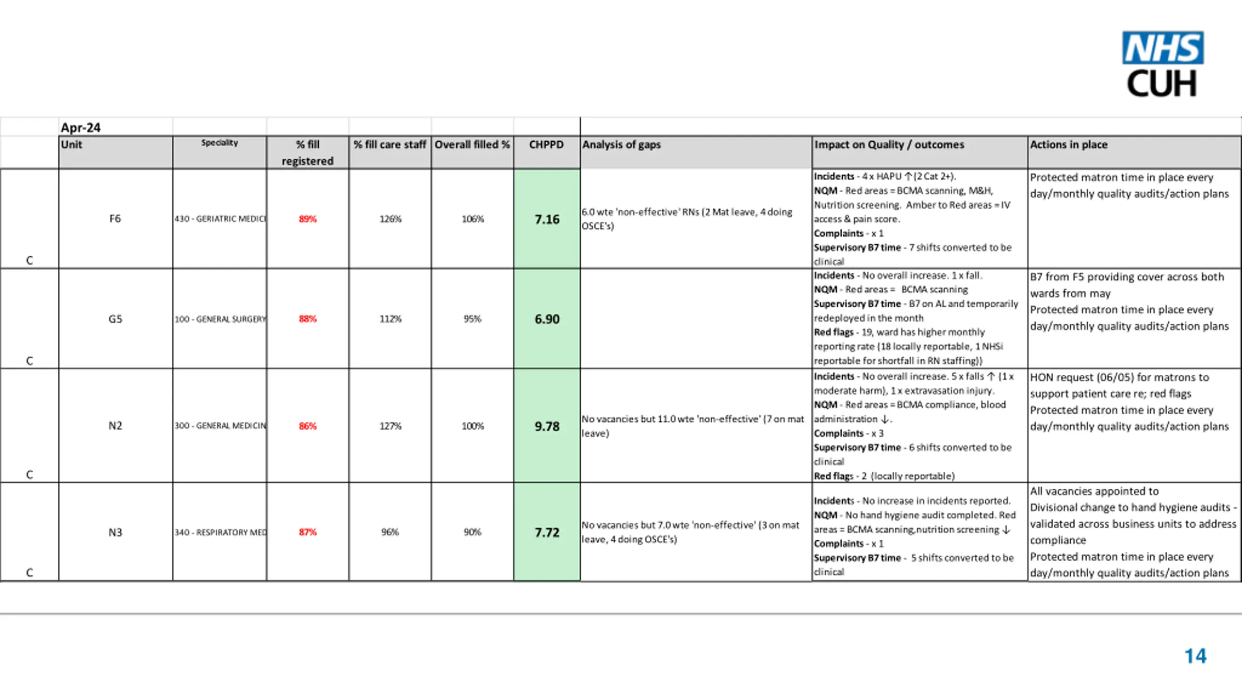 Apr-24 Unit Speciality % fill % fill care staff Overall filled % CHPPD Analysis of gaps Impact on Quality / outcomes Actions in place registered Incidents - 4 x HAPU (2 Cat 2+). NQM - Red areas = BCMA scanning, M&H, Nutrition screening. Amber to Red areas = IV access & pain score. Complaints - x 1 Supervisory B7 time - 7 shifts converted to be clinical Incidents - No overall increase. 1 x fall. NQM - Red areas = BCMA scanning Supervisory B7 time - B7 on AL and temporarily redeployed in the month Red flags - 19, ward has higher monthly reporting rate (18 locally reportable, 1 NHSi reportable for shortfall in RN staffing)) Incidents - v . x x moderate harm), 1 x extravasation injury. NQM - Red areas = BCMA compliance, blood . Complaints - x 3 Supervisory B7 time - 6 shifts converted to be clinical Red flags - 2 (locally reportable) Protected matron time in place every day/monthly quality audits/action plans 6.0 wte 'non-effective' RNs (2 Mat leave, 4 doing OSCE's) 7.16 F6 89% 126% 106% 430 - GERIATRIC MEDICINE C B7 from F5 providing cover across both wards from may Protected matron time in place every day/monthly quality audits/action plans 6.90 G5 88% 112% 95% 100 - GENERAL SURGERY C HON request (06/05) for matrons to support patient care re; red flags Protected matron time in place every day/monthly quality audits/action plans No vacancies but 11.0 wte 'non-effective' (7 on mat leave) 9.78 N2 86% 127% 100% 300 - GENERAL MEDICINE C All vacancies appointed to Divisional change to hand hygiene audits - validated across business units to address compliance Protected matron time in place every day/monthly quality audits/action plans Incidents - No increase in incidents reported. NQM - No hand hygiene audit completed. Red areas = BCMA scanning,nutrition screening Complaints - x 1 Supervisory B7 time - 5 shifts converted to be clinical No vacancies but 7.0 wte 'non-effective' (3 on mat leave, 4 doing OSCE's) 7.72 N3 87% 96% 90% 340 - RESPIRATORY MEDICINE C 14