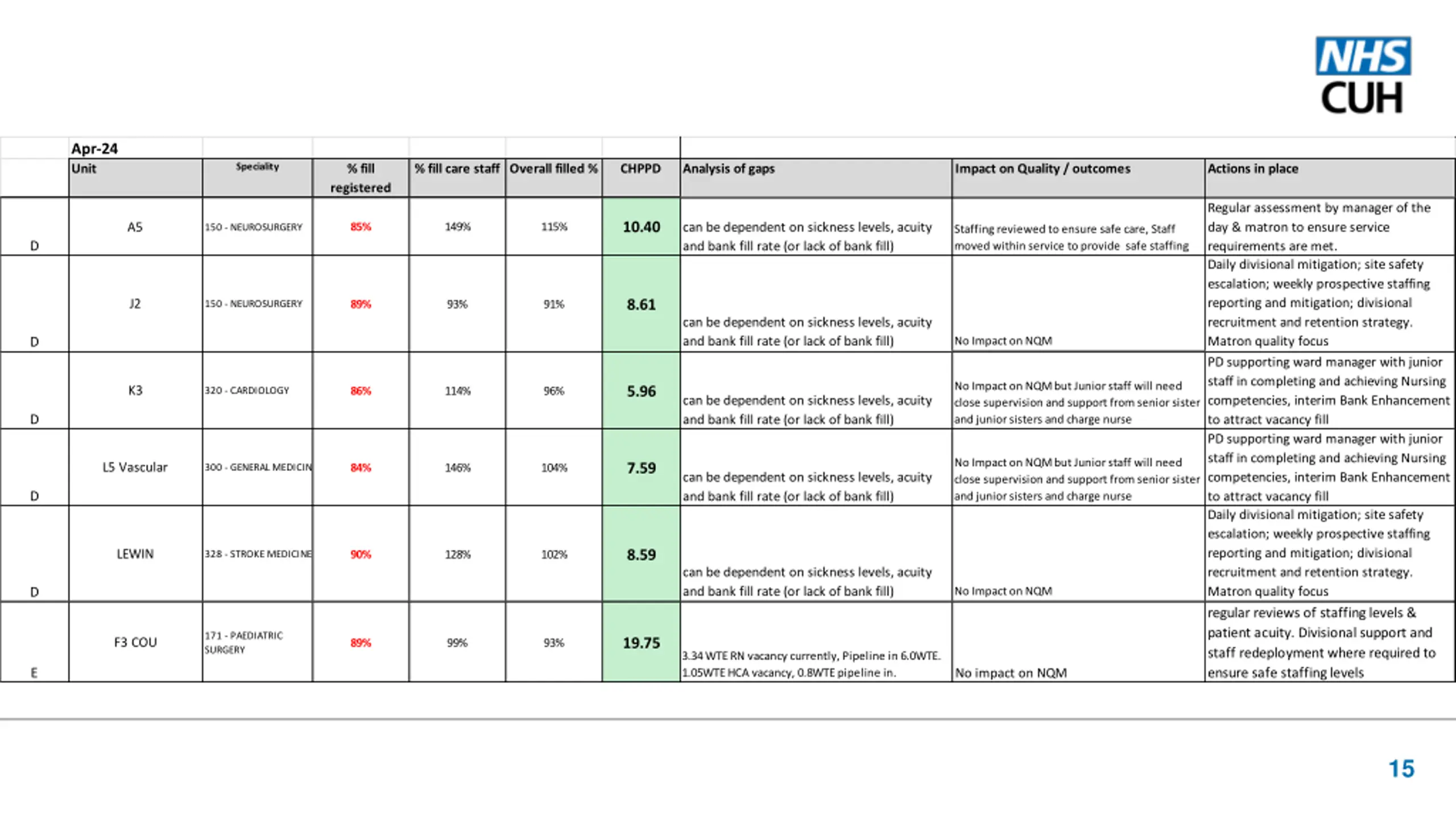 Apr-24 Unit Speciality % fill % fill care staff Overall filled % CHPPD Analysis of gaps Impact on Quality / outcomes Actions in place registered Regular assessment by manager of the day & matron to ensure service requirements are met. Daily divisional mitigation; site safety escalation; weekly prospective staffing reporting and mitigation; divisional recruitment and retention strategy. Matron quality focus PD supporting ward manager with junior staff in completing and achieving Nursing competencies, interim Bank Enhancement to attract vacancy fill PD supporting ward manager with junior staff in completing and achieving Nursing competencies, interim Bank Enhancement to attract vacancy fill Daily divisional mitigation; site safety escalation; weekly prospective staffing reporting and mitigation; divisional recruitment and retention strategy. Matron quality focus regular reviews of staffing levels & patient acuity. Divisional support and staff redeployment where required to ensure safe staffing levels 10.40 A5 can be dependent on sickness levels, acuity and bank fill rate (or lack of bank fill) 85% 149% 115% 150 - NEUROSURGERY Staffing reviewed to ensure safe care, Staff moved within service to provide safe staffing D 8.61 J2 89% 93% 91% 150 - NEUROSURGERY can be dependent on sickness levels, acuity and bank fill rate (or lack of bank fill) D No Impact on NQM No Impact on NQM but Junior staff will need close supervision and support from senior sister and junior sisters and charge nurse 5.96 K3 86% 114% 96% 320 - CARDIOLOGY can be dependent on sickness levels, acuity and bank fill rate (or lack of bank fill) D No Impact on NQM but Junior staff will need close supervision and support from senior sister and junior sisters and charge nurse 7.59 L5 Vascular 84% 146% 104% 300 - GENERAL MEDICINE can be dependent on sickness levels, acuity and bank fill rate (or lack of bank fill) D 8.59 LEWIN 90% 128% 102% 328 - STROKE MEDICINE can be dependent on sickness levels, acuity and bank fill rate (or lack of bank fill) D No Impact on NQM 171 - PAEDIATRIC SURGERY 19.75 F3 COU 89% 99% 93% 3.34 WTE RN vacancy currently, Pipeline in 6.0WTE. 1.05WTE HCA vacancy, 0.8WTE pipeline in. E No impact on NQM 15