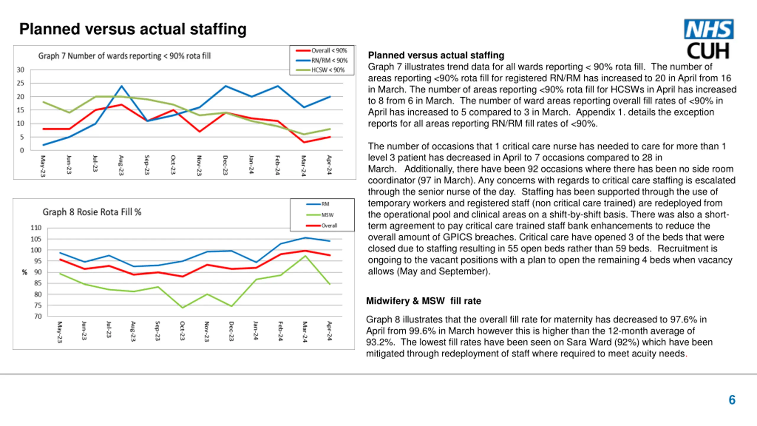 Planned versus actual staffing Planned versus actual staffing Graph 7 illustrates trend data for all wards reporting < 90% rota fill. The number of areas reporting <90% rota fill for registered RN/RM has increased to 20 in April from 16 in March. The number of areas reporting <90% rota fill for HCSWs in April has increased to 8 from 6 in March. The number of ward areas reporting overall fill rates of <90% in April has increased to 5 compared to 3 in March. Appendix 1. details the exception reports for all areas reporting RN/RM fill rates of <90%. The number of occasions that 1 critical care nurse has needed to care for more than 1 level 3 patient has decreased in April to 7 occasions compared to 28 in March. Additionally, there have been 92 occasions where there has been no side room coordinator (97 in March). Any concerns with regards to critical care staffing is escalated through the senior nurse of the day. Staffing has been supported through the use of temporary workers and registered staff (non critical care trained) are redeployed from the operational pool and clinical areas on a shift-by-shift basis. There was also a short- term agreement to pay critical care trained staff bank enhancements to reduce the overall amount of GPICS breaches. Critical care have opened 3 of the beds that were closed due to staffing resulting in 55 open beds rather than 59 beds. Recruitment is ongoing to the vacant positions with a plan to open the remaining 4 beds when vacancy allows (May and September). Midwifery & MSW fill rate Graph 8 illustrates that the overall fill rate for maternity has decreased to 97.6% in April from 99.6% in March however this is higher than the 12-month average of 93.2%. The lowest fill rates have been seen on Sara Ward (92%) which have been mitigated through redeployment of staff where required to meet acuity needs. 6