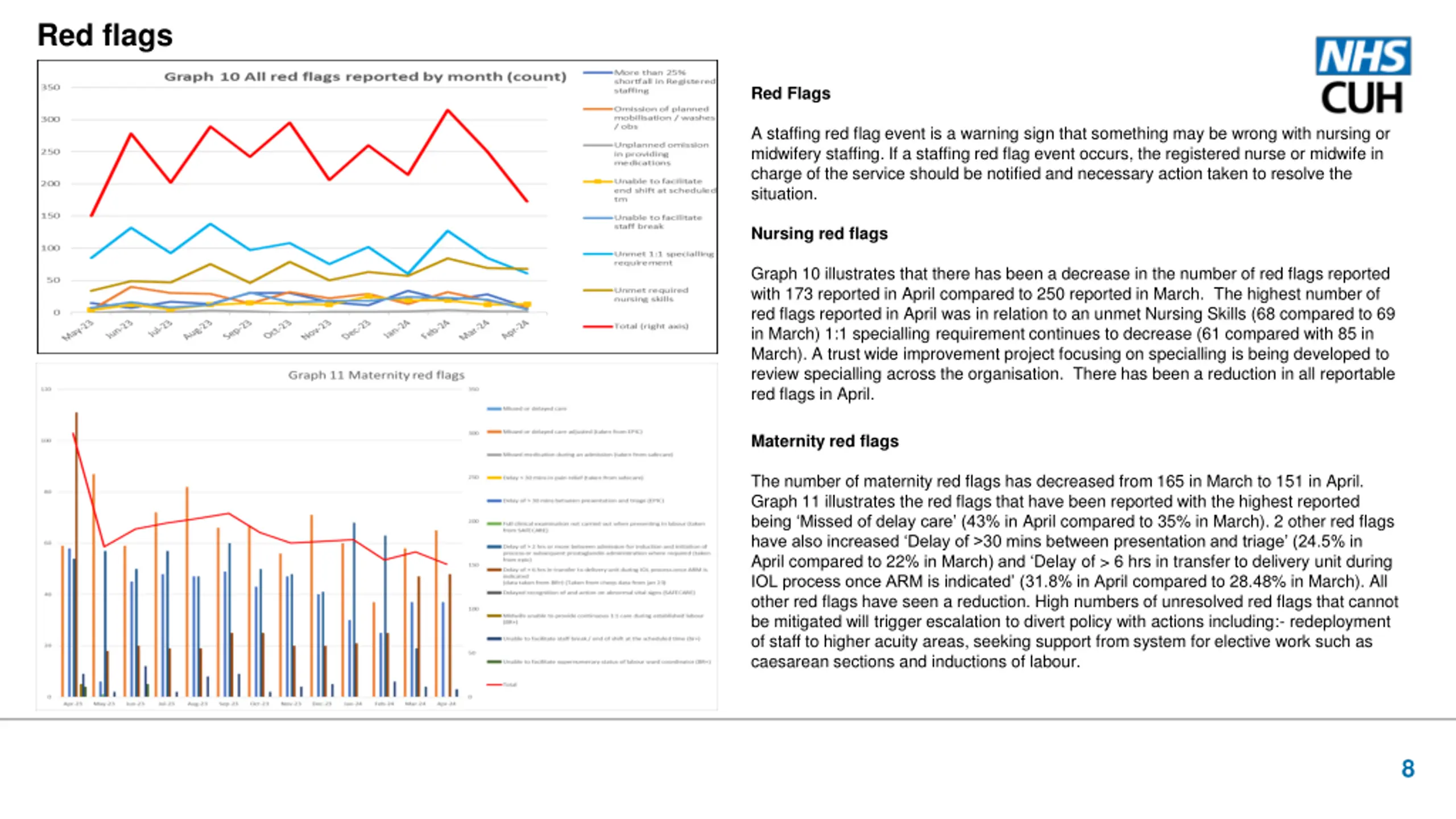 Red flags Red Flags A staffing red flag event is a warning sign that something may be wrong with nursing or midwifery staffing. If a staffing red flag event occurs, the registered nurse or midwife in charge of the service should be notified and necessary action taken to resolve the situation. Nursing red flags Graph 10 illustrates that there has been a decrease in the number of red flags reported with 173 reported in April compared to 250 reported in March. The highest number of red flags reported in April was in relation to an unmet Nursing Skills (68 compared to 69 in March) 1:1 specialling requirement continues to decrease (61 compared with 85 in March). A trust wide improvement project focusing on specialling is being developed to review specialling across the organisation. There has been a reduction in all reportable red flags in April. Maternity red flags The number of maternity red flags has decreased from 165 in March to 151 in April. Graph 11 illustrates the red flags that have been reported with the highest reported being Missed of delay care (43% in April compared to 35% in March). 2 other red flags have also increased Delay of >30 mins between presentation and triage (24.5% in April compared to 22% in March) and Delay of > 6 hrs in transfer to delivery unit during IOL process once ARM is indicated (31.8% in April compared to 28.48% in March). All other red flags have seen a reduction. High numbers of unresolved red flags that cannot be mitigated will trigger escalation to divert policy with actions including:- redeployment of staff to higher acuity areas, seeking support from system for elective work such as caesarean sections and inductions of labour. 8