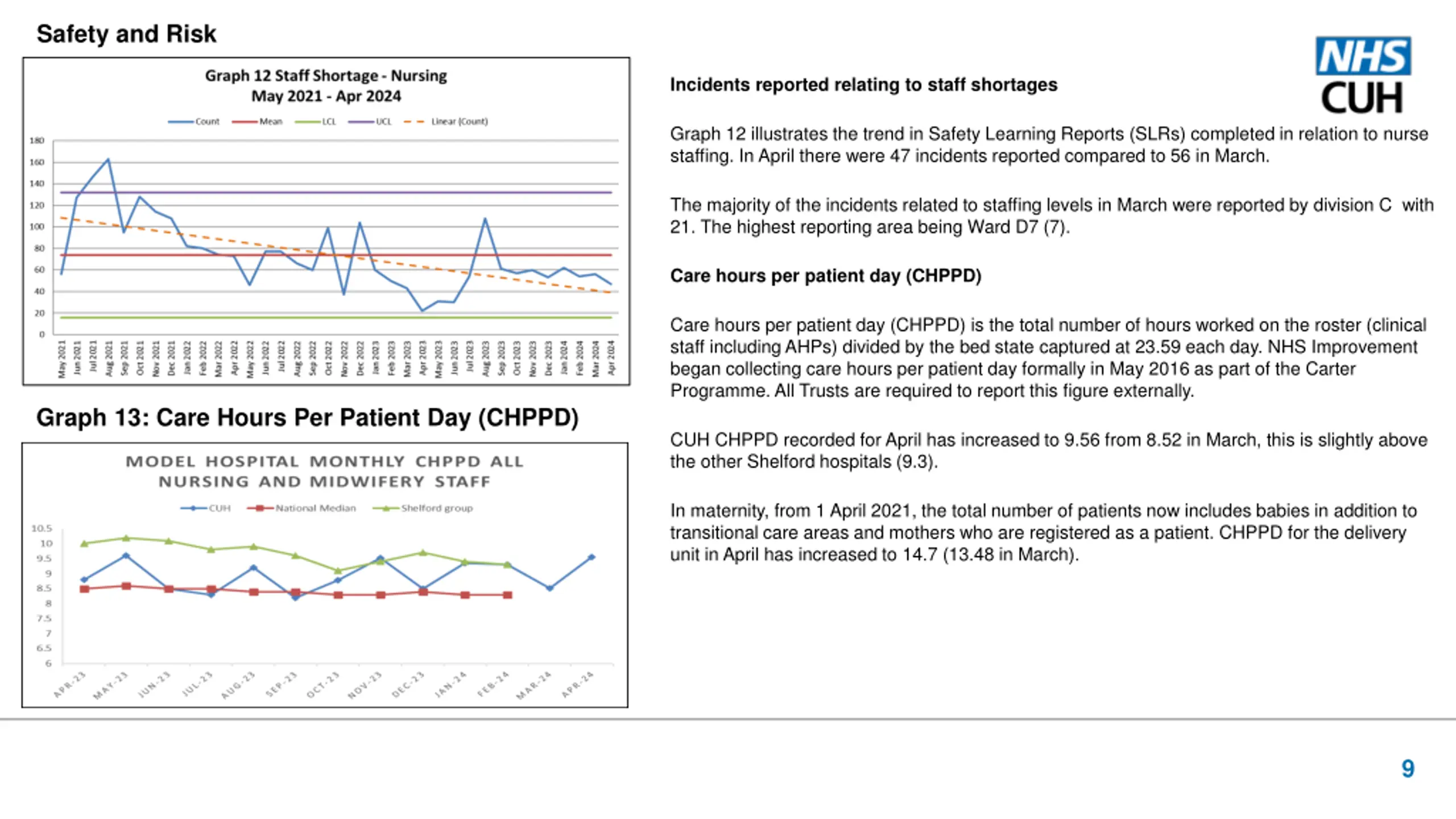 Safety and Risk Incidents reported relating to staff shortages Graph 12 illustrates the trend in Safety Learning Reports (SLRs) completed in relation to nurse staffing. In April there were 47 incidents reported compared to 56 in March. The majority of the incidents related to staffing levels in March were reported by division C with 21. The highest reporting area being Ward D7 (7). Care hours per patient day (CHPPD) Care hours per patient day (CHPPD) is the total number of hours worked on the roster (clinical staff including AHPs) divided by the bed state captured at 23.59 each day. NHS Improvement began collecting care hours per patient day formally in May 2016 as part of the Carter Programme. All Trusts are required to report this figure externally. Graph 13: Care Hours Per Patient Day (CHPPD) CUH CHPPD recorded for April has increased to 9.56 from 8.52 in March, this is slightly above the other Shelford hospitals (9.3). In maternity, from 1 April 2021, the total number of patients now includes babies in addition to transitional care areas and mothers who are registered as a patient. CHPPD for the delivery unit in April has increased to 14.7 (13.48 in March). 9