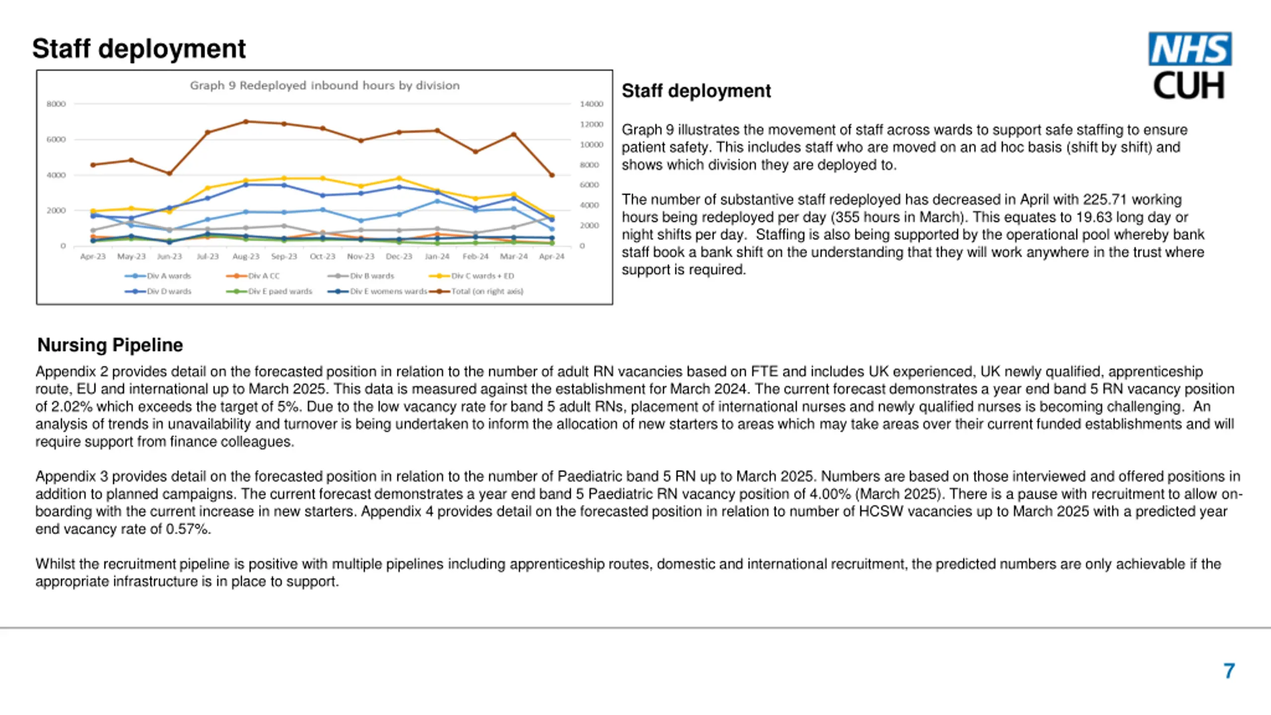 Staff deployment Staff deployment Graph 9 illustrates the movement of staff across wards to support safe staffing to ensure patient safety. This includes staff who are moved on an ad hoc basis (shift by shift) and shows which division they are deployed to. The number of substantive staff redeployed has decreased in April with 225.71 working hours being redeployed per day (355 hours in March). This equates to 19.63 long day or night shifts per day. Staffing is also being supported by the operational pool whereby bank staff book a bank shift on the understanding that they will work anywhere in the trust where support is required. Nursing Pipeline Appendix 2 provides detail on the forecasted position in relation to the number of adult RN vacancies based on FTE and includes UK experienced, UK newly qualified, apprenticeship route, EU and international up to March 2025. This data is measured against the establishment for March 2024. The current forecast demonstrates a year end band 5 RN vacancy position of 2.02% which exceeds the target of 5%. Due to the low vacancy rate for band 5 adult RNs, placement of international nurses and newly qualified nurses is becoming challenging. An analysis of trends in unavailability and turnover is being undertaken to inform the allocation of new starters to areas which may take areas over their current funded establishments and will require support from finance colleagues. Appendix 3 provides detail on the forecasted position in relation to the number of Paediatric band 5 RN up to March 2025. Numbers are based on those interviewed and offered positions in addition to planned campaigns. The current forecast demonstrates a year end band 5 Paediatric RN vacancy position of 4.00% (March 2025). There is a pause with recruitment to allow on- boarding with the current increase in new starters. Appendix 4 provides detail on the forecasted position in relation to number of HCSW vacancies up to March 2025 with a predicted year end vacancy rate of 0.57%. Whilst the recruitment pipeline is positive with multiple pipelines including apprenticeship routes, domestic and international recruitment, the predicted numbers are only achievable if the appropriate infrastructure is in place to support. 7