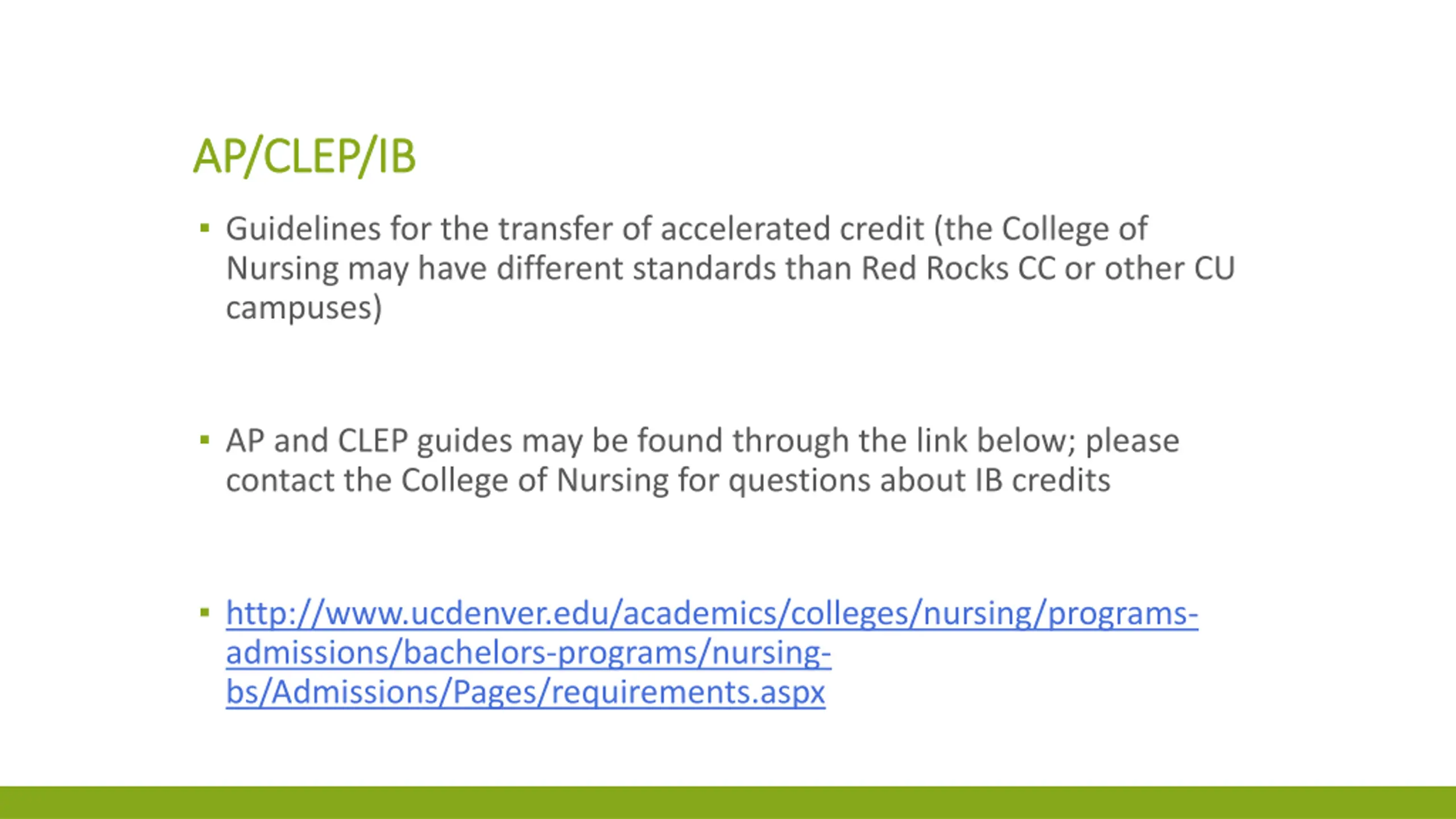 AP/CLEP/IB AP/CLEP/IB Guidelines for the transfer of accelerated credit (the College of Nursing may have different standards than Red Rocks CC or other CU campuses) AP and CLEP guides may be found through the link below; please contact the College of Nursing for questions about IB credits http://www.ucdenver.edu/academics/colleges/nursing/programs- admissions/bachelors-programs/nursing- bs/Admissions/Pages/requirements.aspx