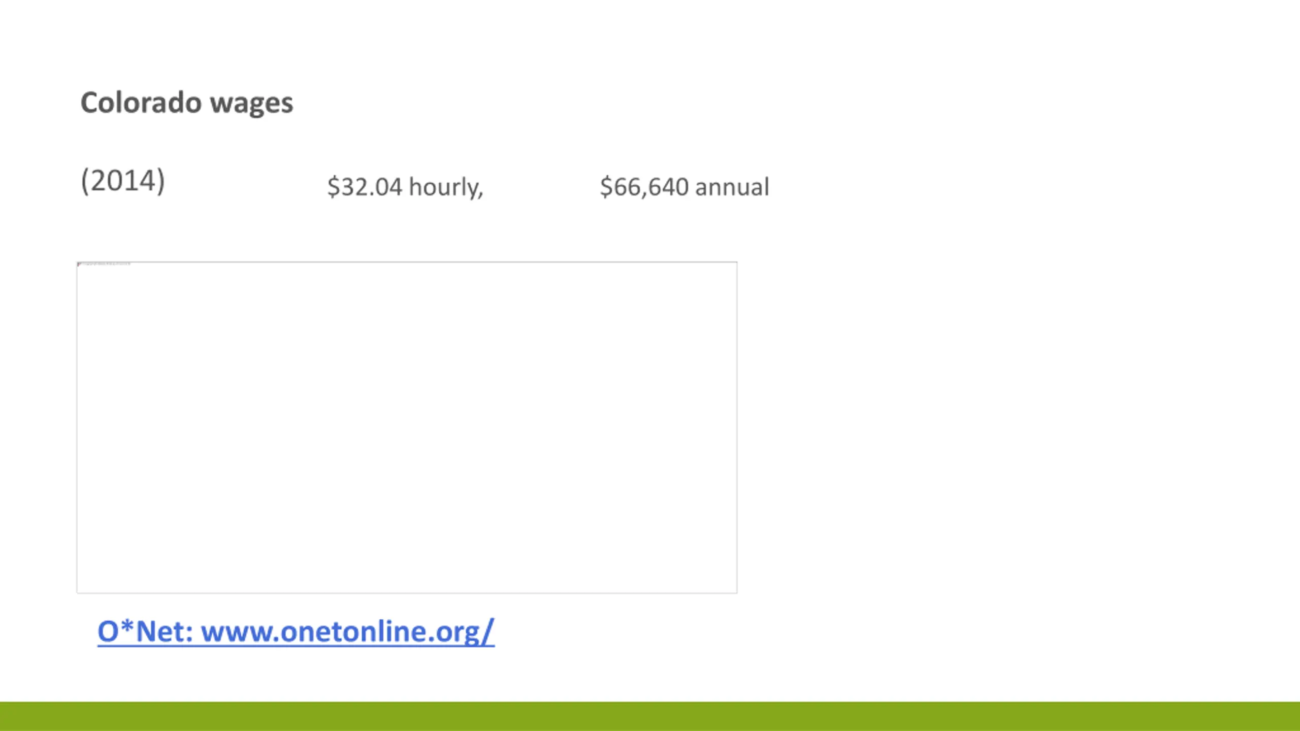Colorado wages (2014) $32.04 hourly, $66,640 annual O*Net: www.onetonline.org/