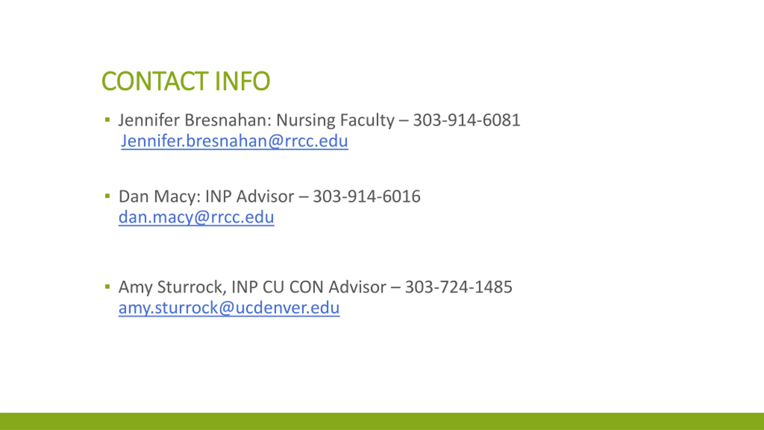 CONTACT INFO CONTACT INFO Jennifer Bresnahan: Nursing Faculty 303-914-6081 Jennifer.bresnahan@rrcc.edu Dan Macy: INP Advisor 303-914-6016 dan.macy@rrcc.edu Amy Sturrock, INP CU CON Advisor 303-724-1485 amy.sturrock@ucdenver.edu