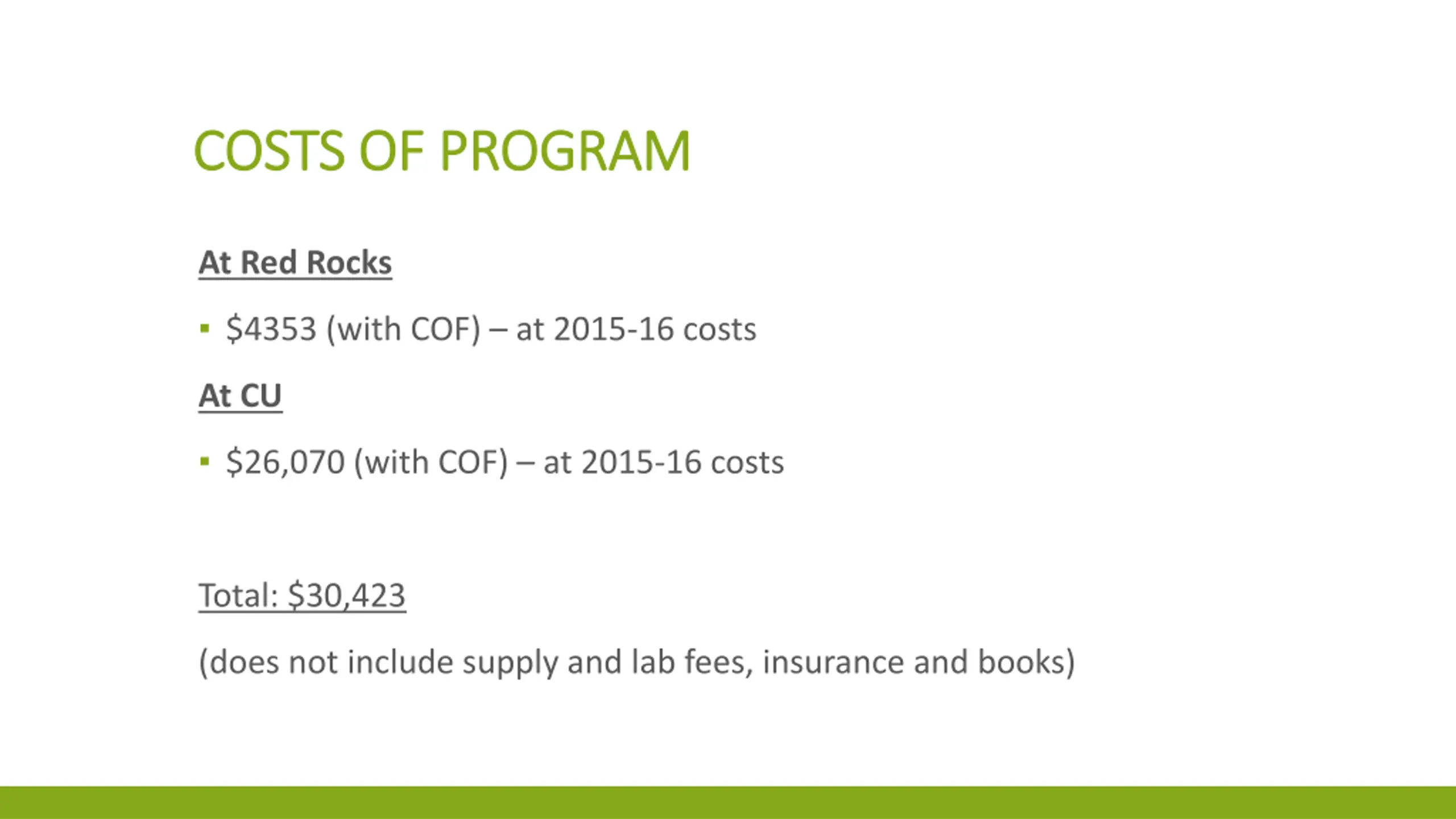 COSTS OF PROGRAM COSTS OF PROGRAM At Red Rocks $4353 (with COF) at 2015-16 costs At CU $26,070 (with COF) at 2015-16 costs Total: $30,423 (does not include supply and lab fees, insurance and books)