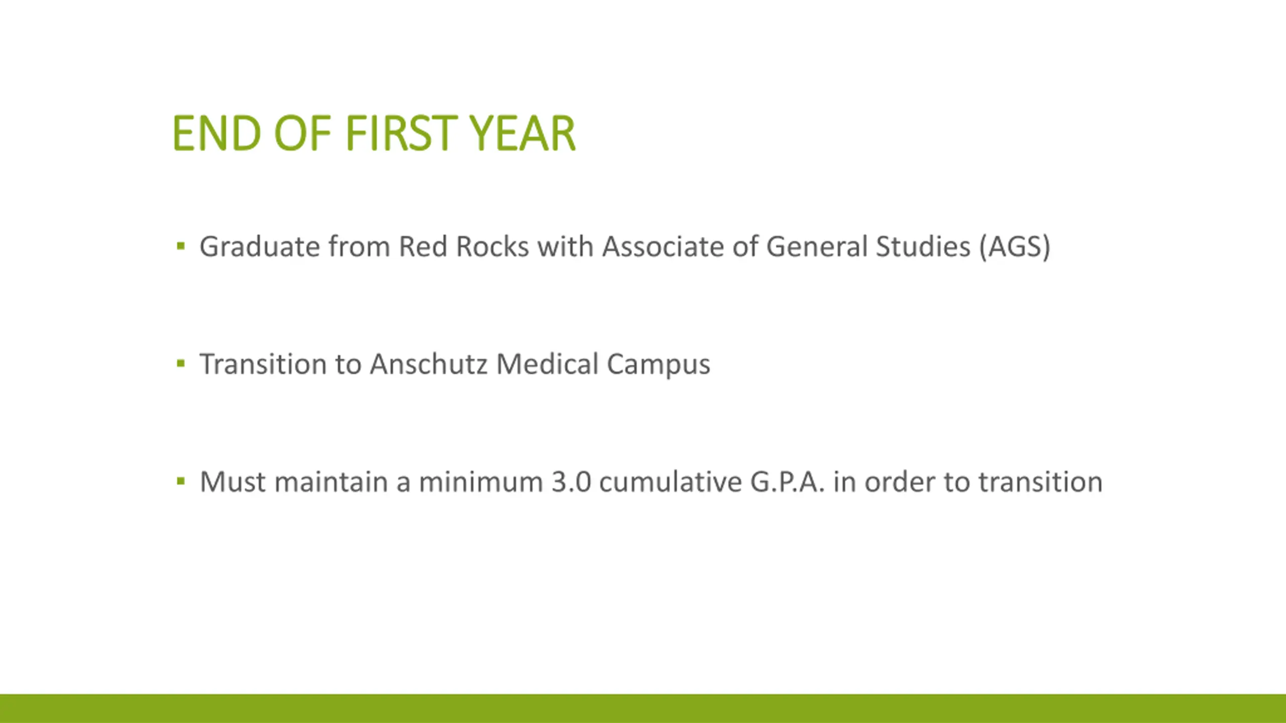 END OF FIRST YEAR END OF FIRST YEAR Graduate from Red Rocks with Associate of General Studies (AGS) Transition to Anschutz Medical Campus Must maintain a minimum 3.0 cumulative G.P.A. in order to transition