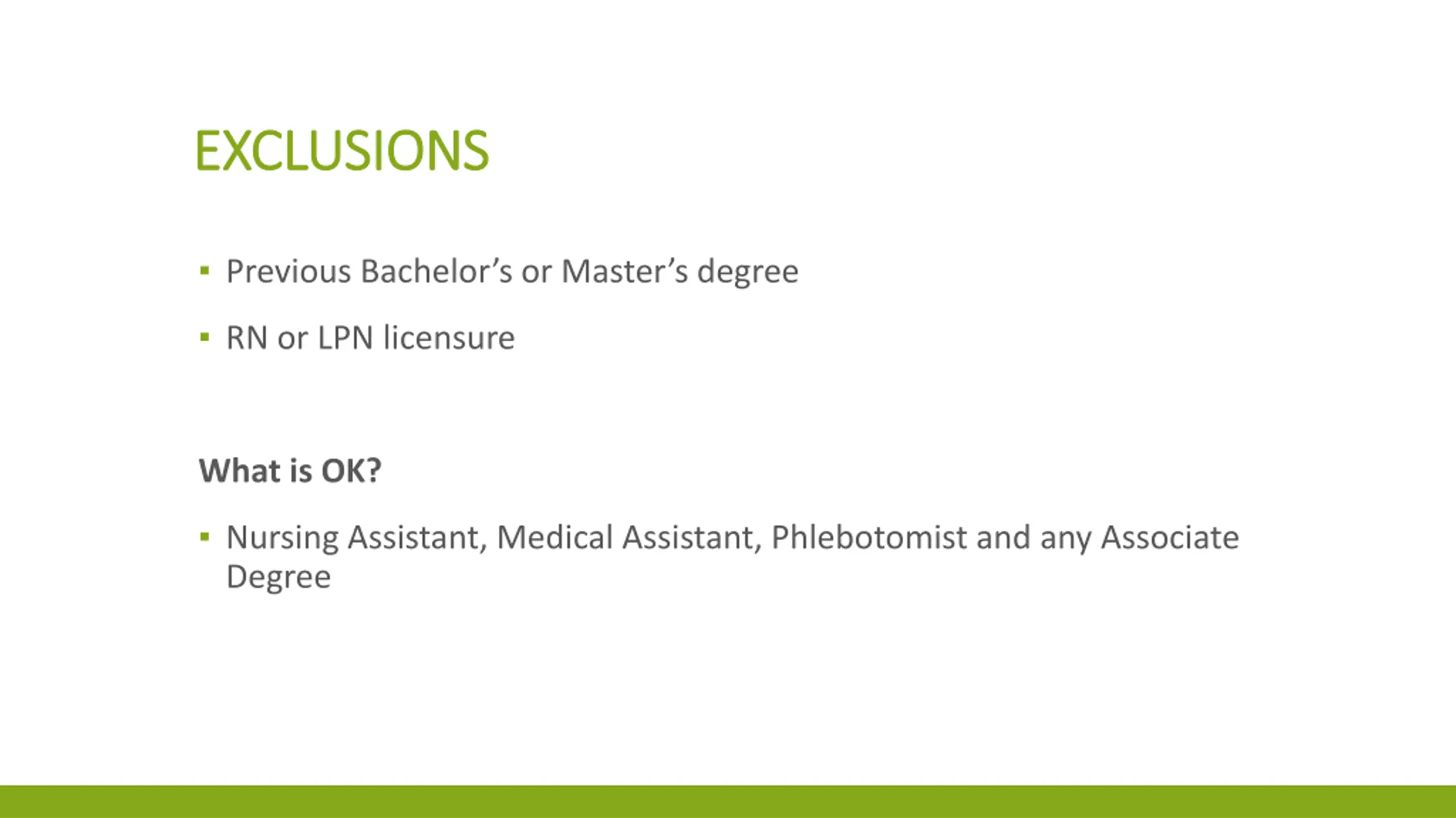 EXCLUSIONS EXCLUSIONS Previous Bachelor s or Master s degree RN or LPN licensure What is OK? Nursing Assistant, Medical Assistant, Phlebotomist and any Associate Degree