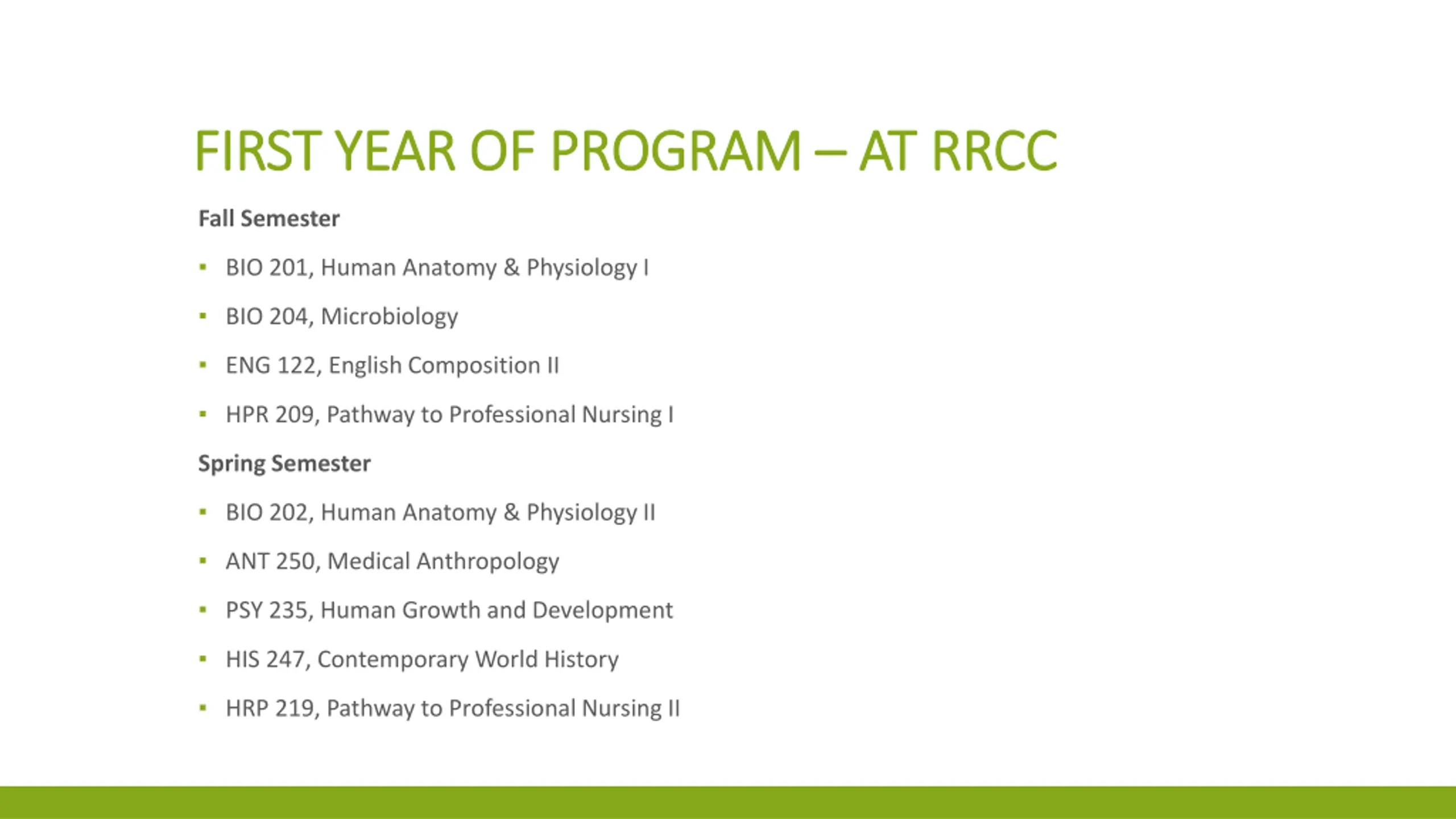 FIRST YEAR OF PROGRAM FIRST YEAR OF PROGRAM AT RRCC AT RRCC Fall Semester BIO 201, Human Anatomy & Physiology I BIO 204, Microbiology ENG 122, English Composition II HPR 209, Pathway to Professional Nursing I Spring Semester BIO 202, Human Anatomy & Physiology II ANT 250, Medical Anthropology PSY 235, Human Growth and Development HIS 247, Contemporary World History HRP 219, Pathway to Professional Nursing II