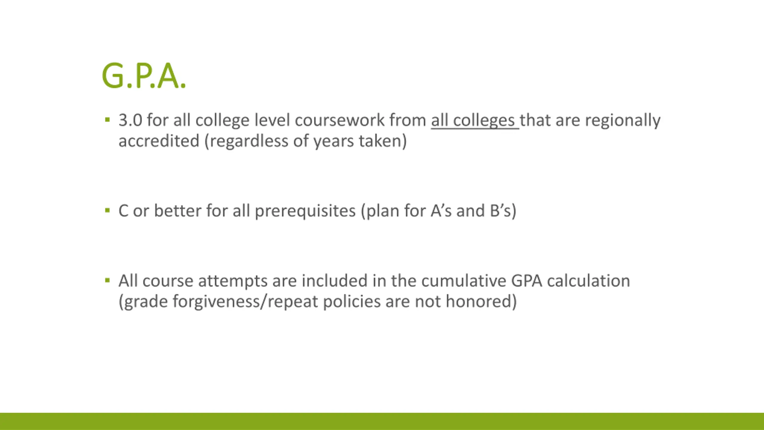 G.P.A. G.P.A. 3.0 for all college level coursework from all colleges that are regionally accredited (regardless of years taken) C or better for all prerequisites (plan for A s and B s) All course attempts are included in the cumulative GPA calculation (grade forgiveness/repeat policies are not honored)