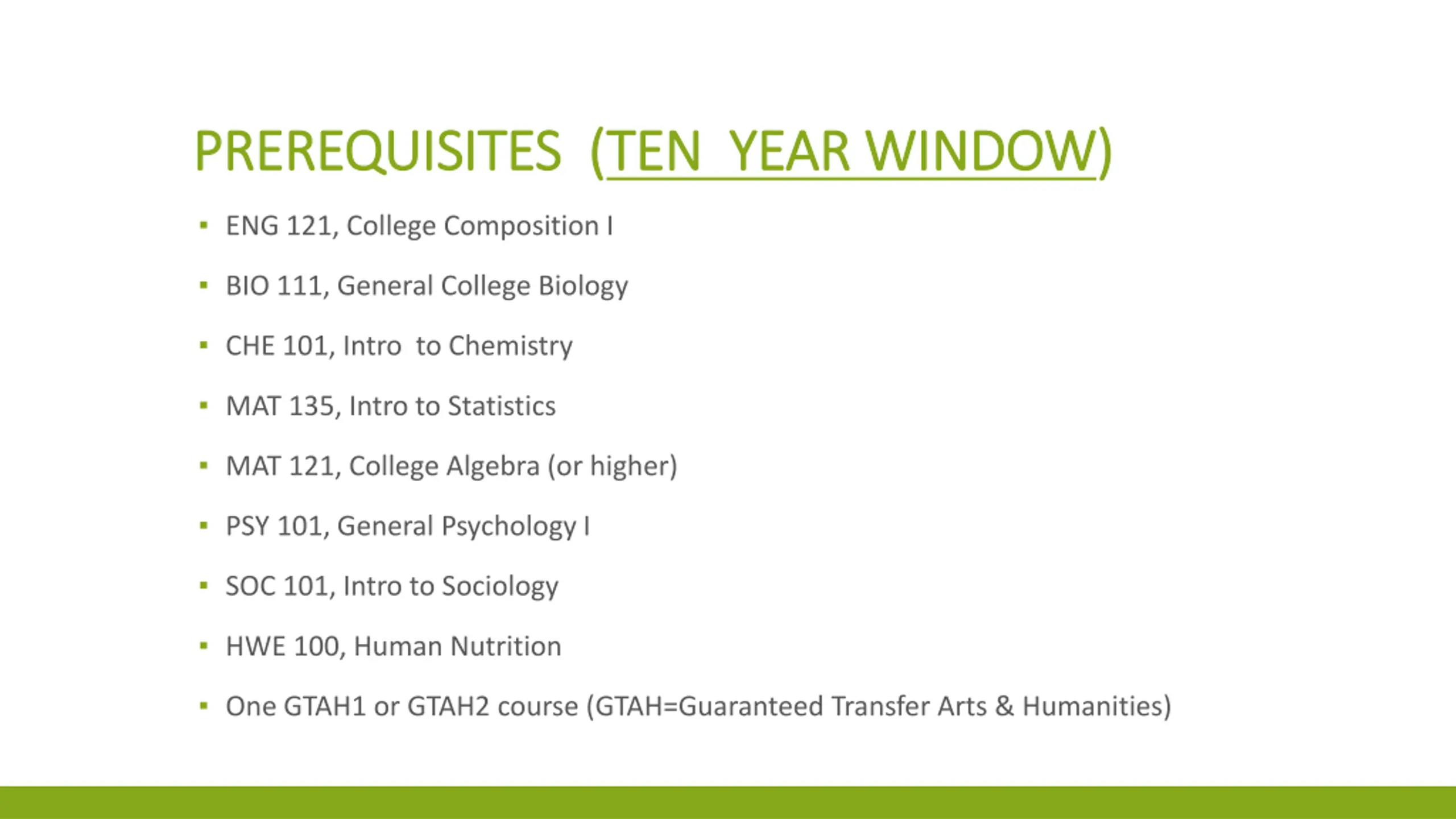 PREREQUISITES ( PREREQUISITES (TEN YEAR WINDOW TEN YEAR WINDOW) ) ENG 121, College Composition I BIO 111, General College Biology CHE 101, Intro to Chemistry MAT 135, Intro to Statistics MAT 121, College Algebra (or higher) PSY 101, General Psychology I SOC 101, Intro to Sociology HWE 100, Human Nutrition One GTAH1 or GTAH2 course (GTAH=Guaranteed Transfer Arts & Humanities)