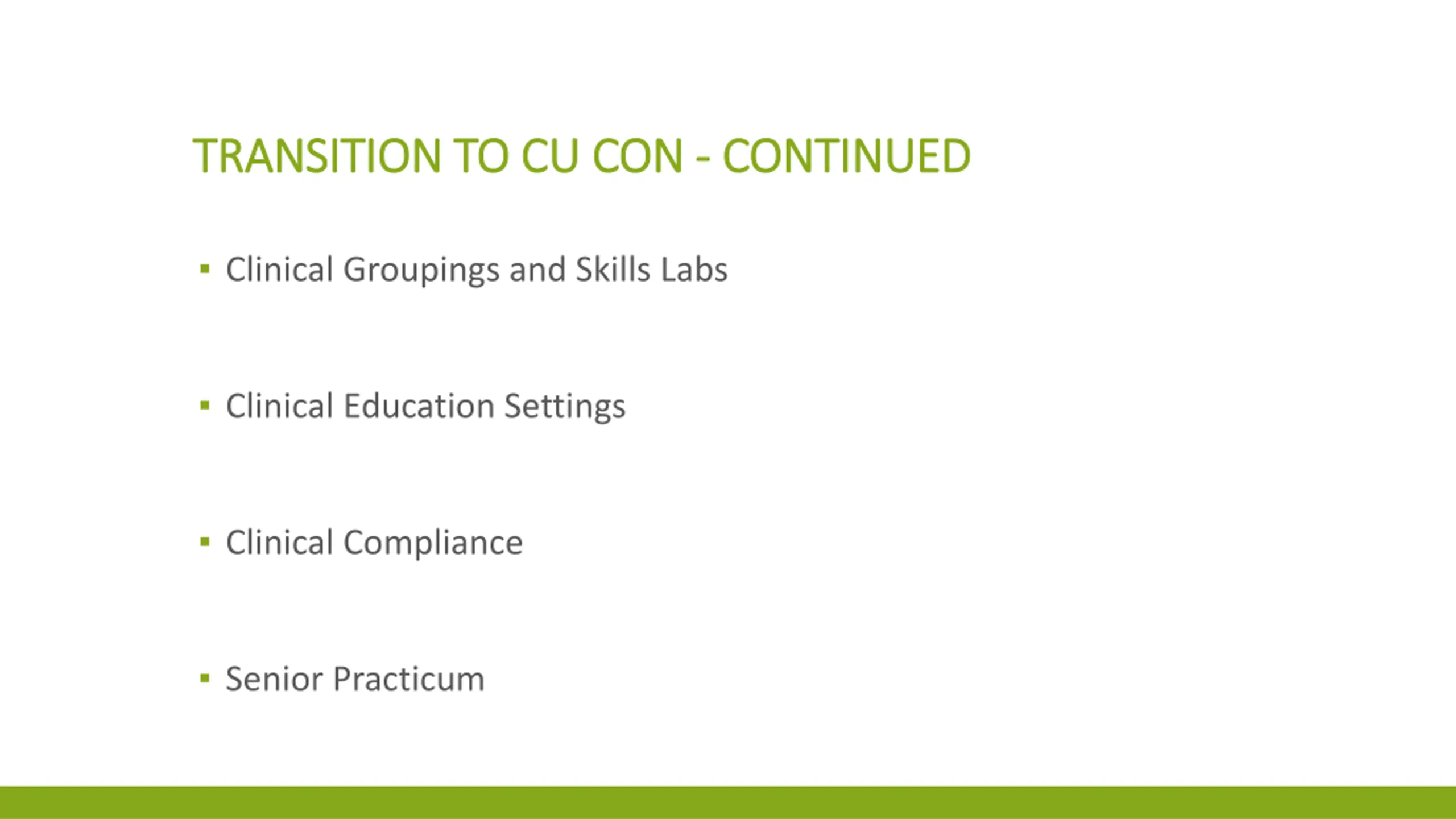 TRANSITION TO CU CON TRANSITION TO CU CON - - CONTINUED CONTINUED Clinical Groupings and Skills Labs Clinical Education Settings Clinical Compliance Senior Practicum
