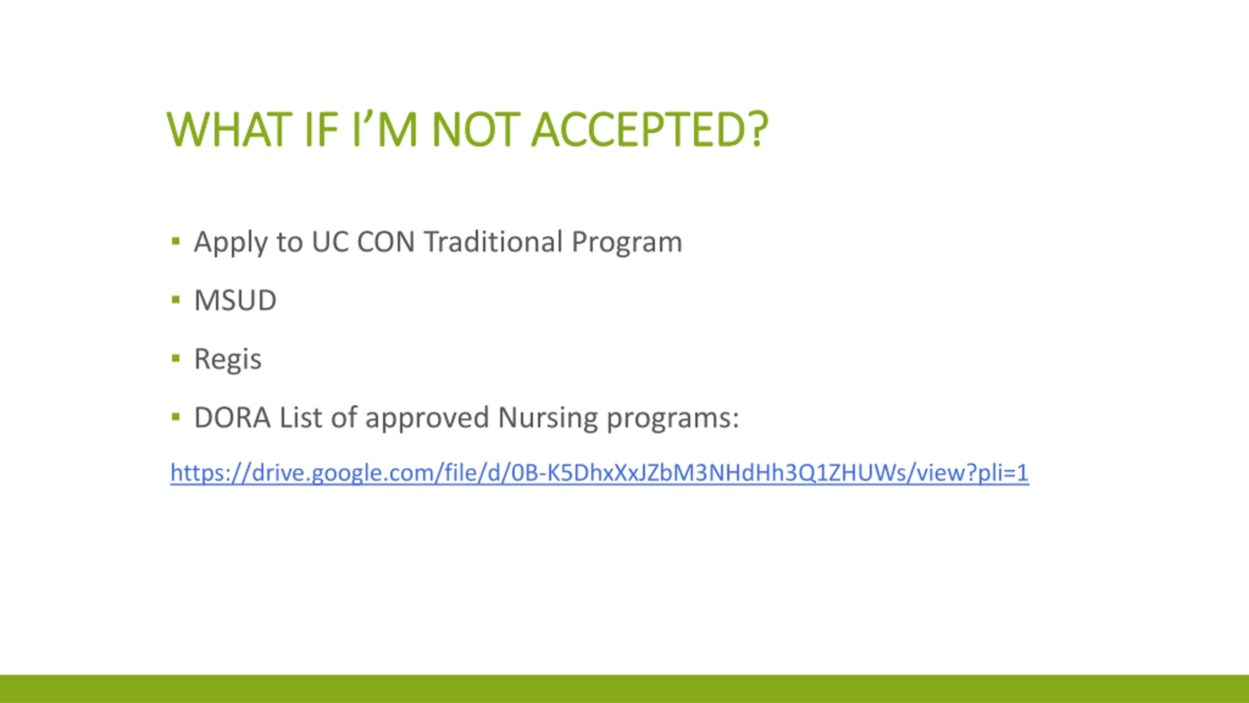 WHAT IF IM NOT ACCEPTED? WHAT IF I M NOT ACCEPTED? Apply to UC CON Traditional Program MSUD Regis DORA List of approved Nursing programs: https://drive.google.com/file/d/0B-K5DhxXxJZbM3NHdHh3Q1ZHUWs/view?pli=1