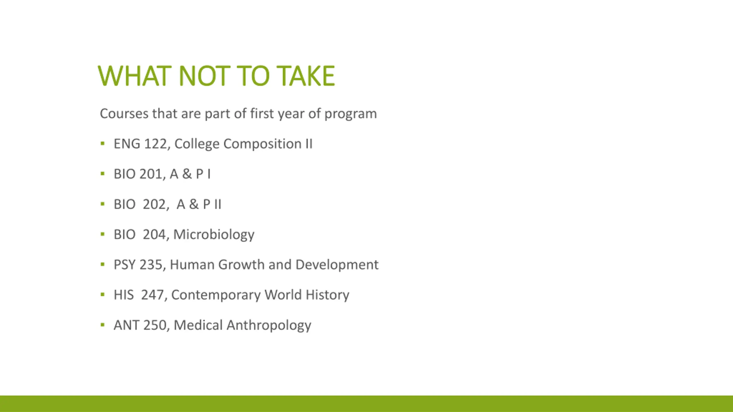 WHAT NOT TO TAKE WHAT NOT TO TAKE Courses that are part of first year of program ENG 122, College Composition II BIO 201, A & P I BIO 202, A & P II BIO 204, Microbiology PSY 235, Human Growth and Development HIS 247, Contemporary World History ANT 250, Medical Anthropology