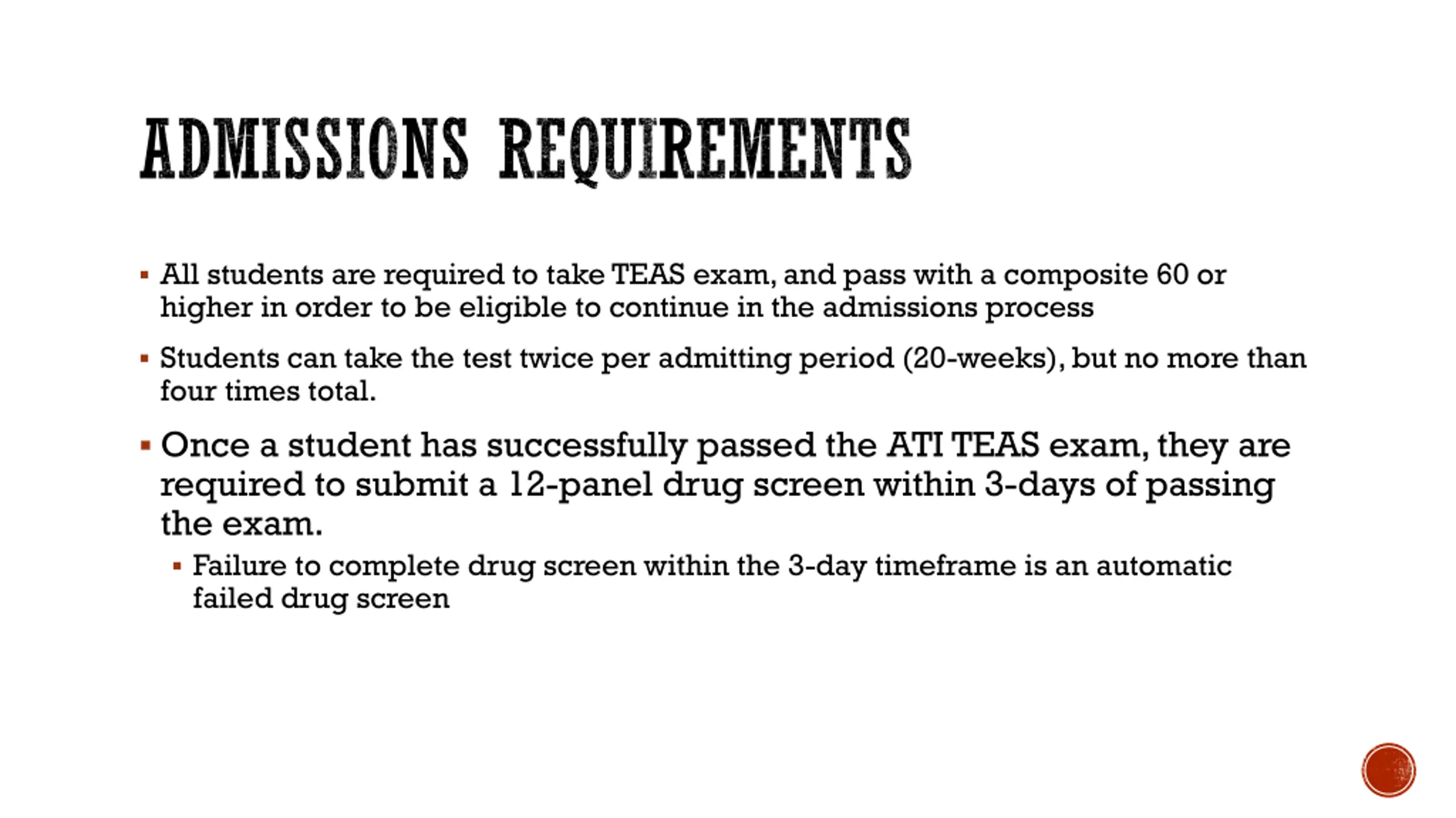 ADMISSIONS REQUIREMENTS All students are required to take TEAS exam, and pass with a composite 60 or higher in order to be eligible to continue in the admissions process Students can take the test twice per admitting period (20-weeks), but no more than four times total. Once a student has successfully passed the ATI TEAS exam, they are required to submit a 12-panel drug screen within 3-days of passing the exam. Failure to complete drug screen within the 3-day timeframe is an automatic failed drug screen