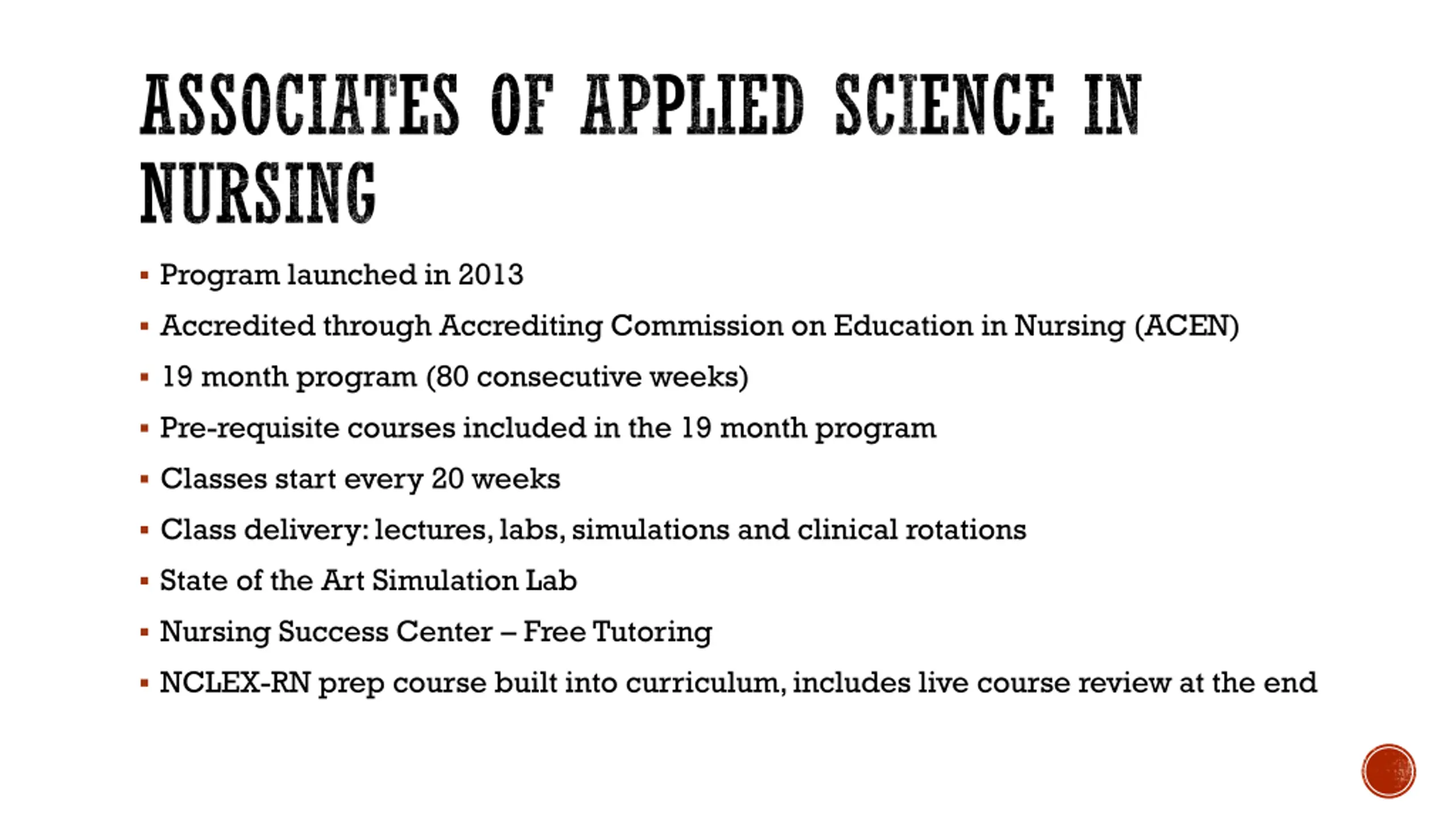ASSOCIATES OF APPLIED SCIENCE IN NURSING Program launched in 2013 Accredited through Accrediting Commission on Education in Nursing (ACEN) 19 month program (80 consecutive weeks) Pre-requisite courses included in the 19 month program Classes start every 20 weeks Class delivery: lectures, labs, simulations and clinical rotations State of the Art Simulation Lab Nursing Success Center Free Tutoring NCLEX-RN prep course built into curriculum, includes live course review at the end