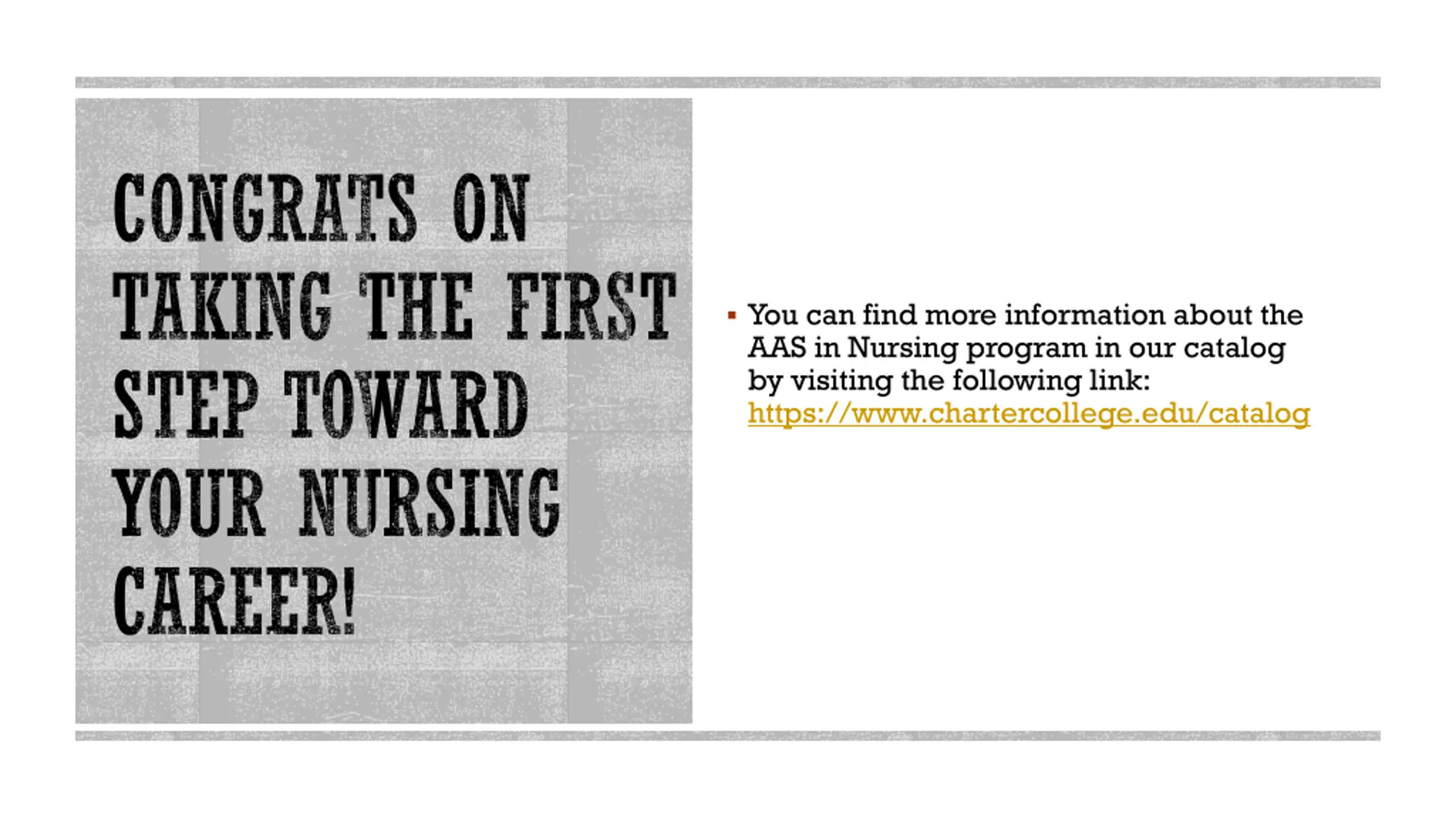 CONGRATS ON TAKING THE FIRST STEP TOWARD YOUR NURSING CAREER! You can find more information about the AAS in Nursing program in our catalog by visiting the following link: https://www.chartercollege.edu/catalog