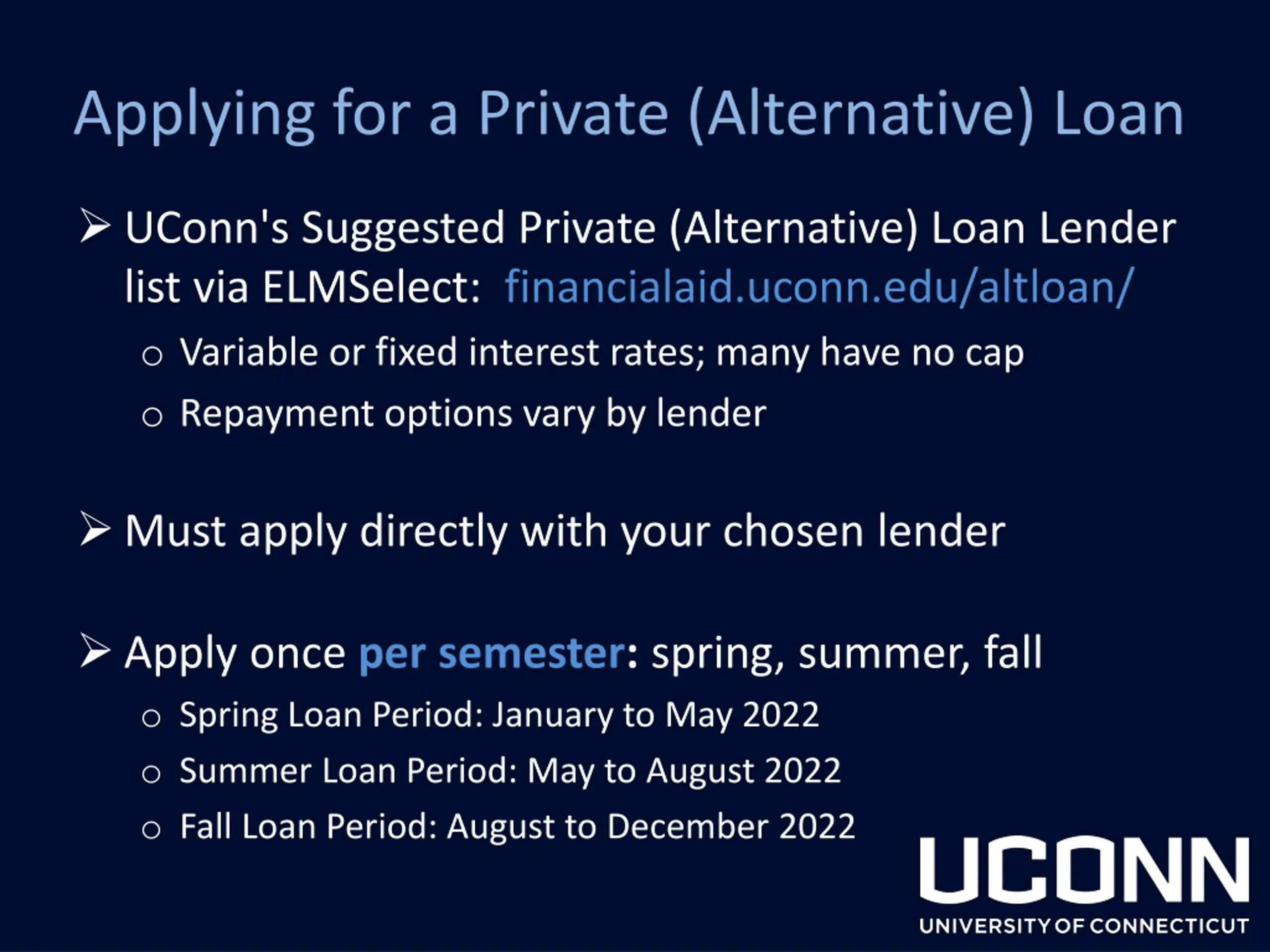 Applying for a Private (Alternative) Loan UConn's Suggested Private (Alternative) Loan Lender list via ELMSelect: financialaid.uconn.edu/altloan/ o Variable or fixed interest rates; many have no cap o Repayment options vary by lender Must apply directly with your chosen lender Apply once per semester: spring, summer, fall o Spring Loan Period: January to May 2022 o Summer Loan Period: May to August 2022 o Fall Loan Period: August to December 2022