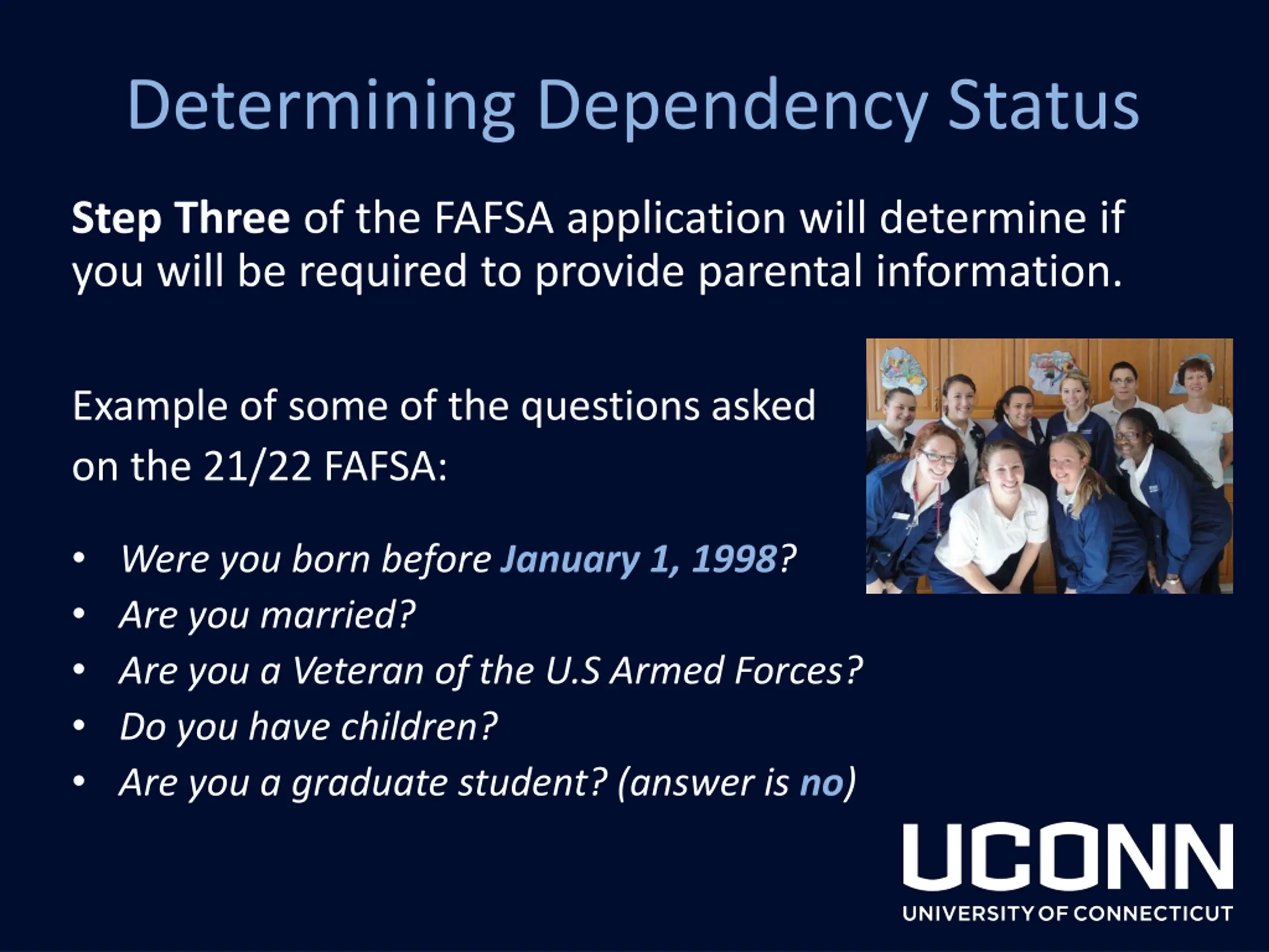 Determining Dependency Status Step Three of the FAFSA application will determine if you will be required to provide parental information. Example of some of the questions asked on the 21/22 FAFSA: Were you born before January 1, 1998? Are you married? Are you a Veteran of the U.S Armed Forces? Do you have children? Are you a graduate student? (answer is no)