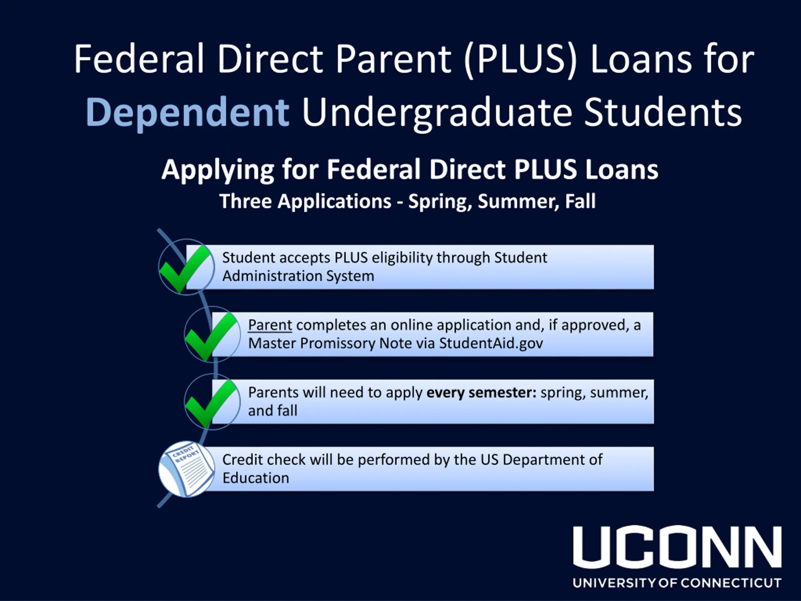 Federal Direct Parent (PLUS) Loans for Dependent Undergraduate Students Applying for Federal Direct PLUS Loans Three Applications - Spring, Summer, Fall Student accepts PLUS eligibility through Student Administration System Parent completes an online application and, if approved, a Master Promissory Note via StudentAid.gov Parents will need to apply every semester: spring, summer, and fall Credit check will be performed by the US Department of Education