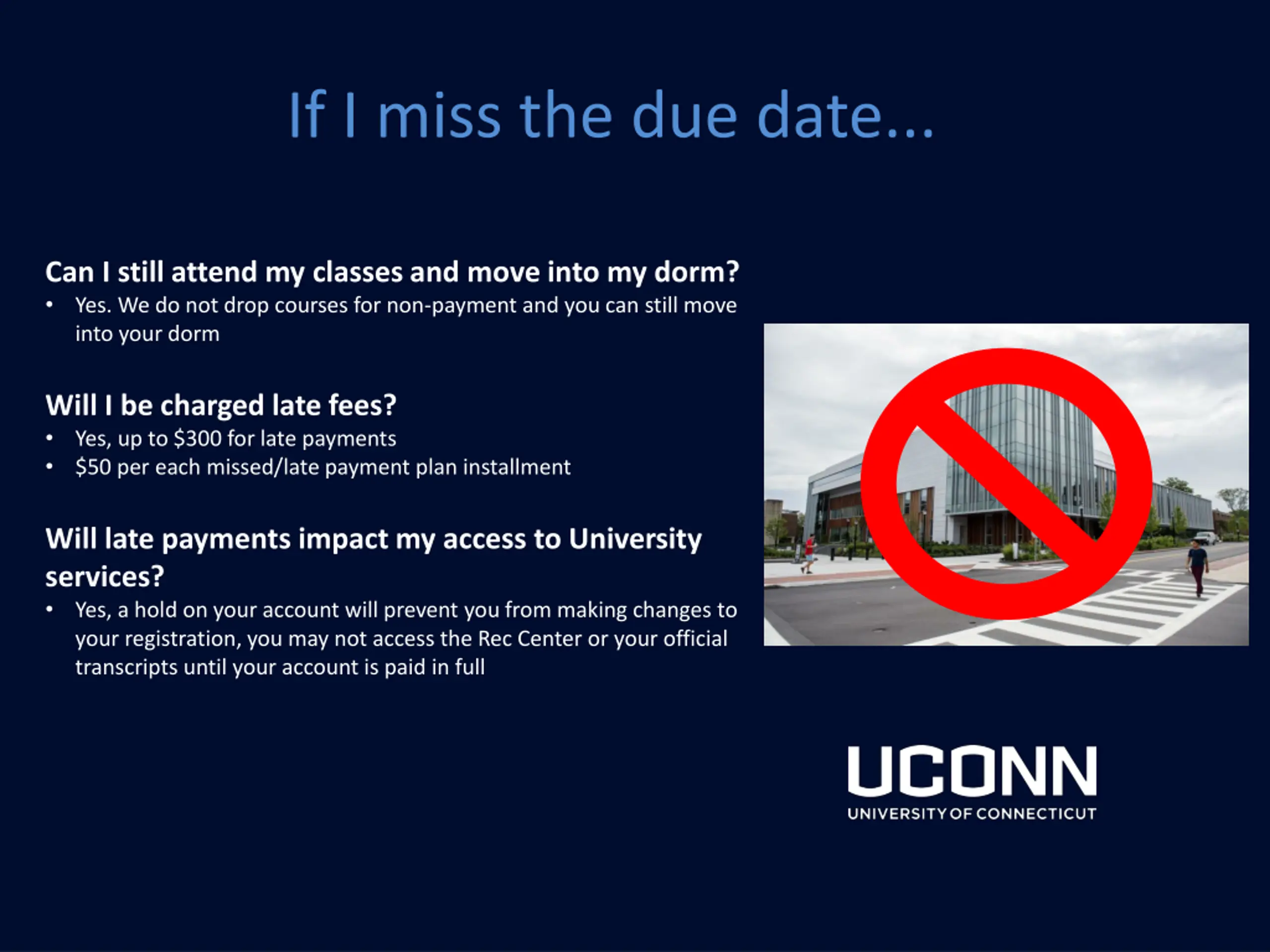If I miss the due date... Can I still attend my classes and move into my dorm? Yes. We do not drop courses for non-payment and you can still move into your dorm Will I be charged late fees? Yes, up to $300 for late payments $50 per each missed/late payment plan installment Will late payments impact my access to University services? Yes, a hold on your account will prevent you from making changes to your registration, you may not access the Rec Center or your official transcripts until your account is paid in full