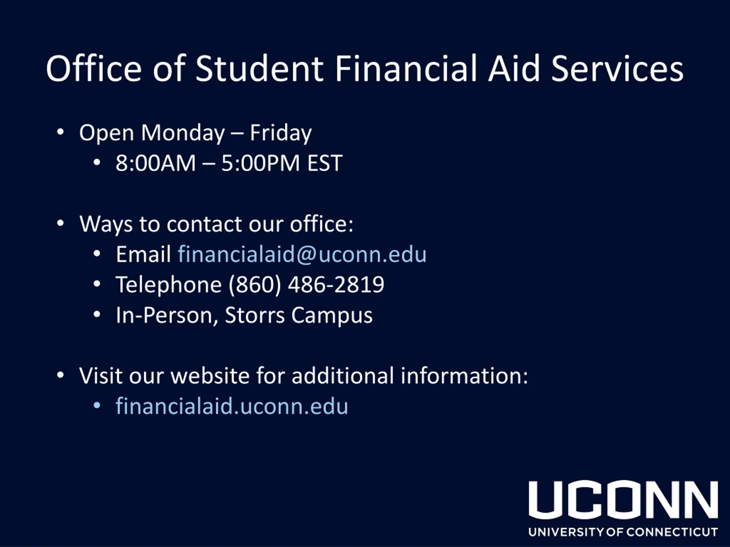 Office of Student Financial Aid Services Open Monday Friday 8:00AM 5:00PM EST Ways to contact our office: Email financialaid@uconn.edu Telephone (860) 486-2819 In-Person, Storrs Campus Visit our website for additional information: financialaid.uconn.edu