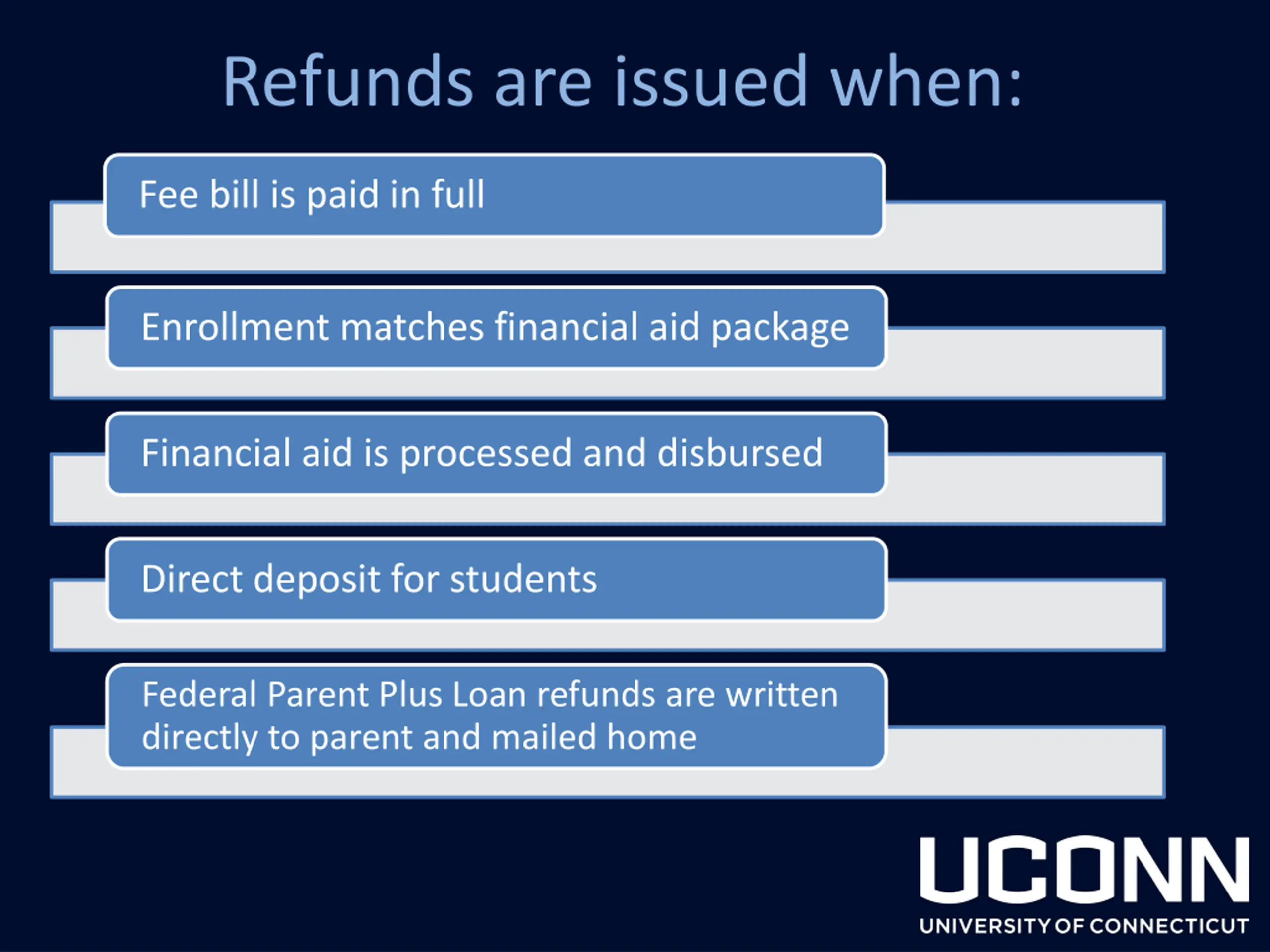 Refunds are issued when: Fee bill is paid in full Enrollment matches financial aid package Financial aid is processed and disbursed Direct deposit for students Federal Parent Plus Loan refunds are written directly to parent and mailed home