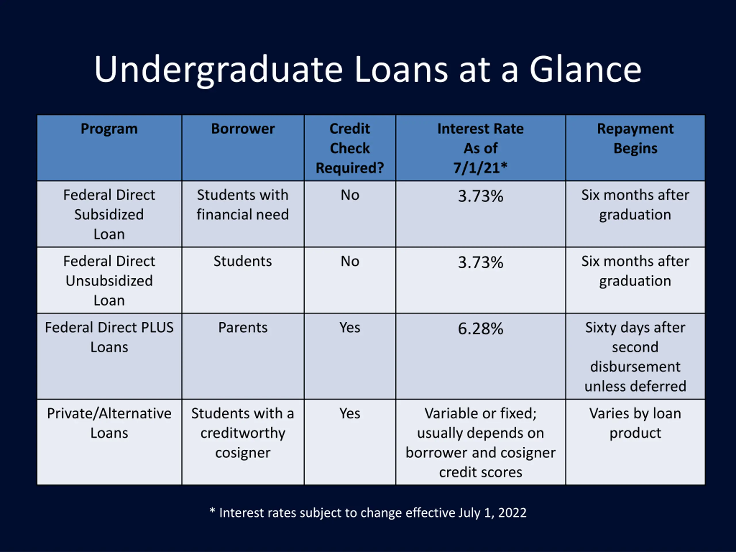 Undergraduate Loans at a Glance Program Borrower Credit Check Required? Interest Rate As of 7/1/21* Repayment Begins Federal Direct Subsidized Loan Students with financial need No Six months after graduation 3.73% Federal Direct Unsubsidized Loan Students No Six months after graduation 3.73% Federal Direct PLUS Loans Parents Yes Sixty days after second disbursement unless deferred 6.28% Private/Alternative Loans Students with a creditworthy cosigner Yes Variable or fixed; usually depends on borrower and cosigner credit scores Varies by loan product * Interest rates subject to change effective July 1, 2022