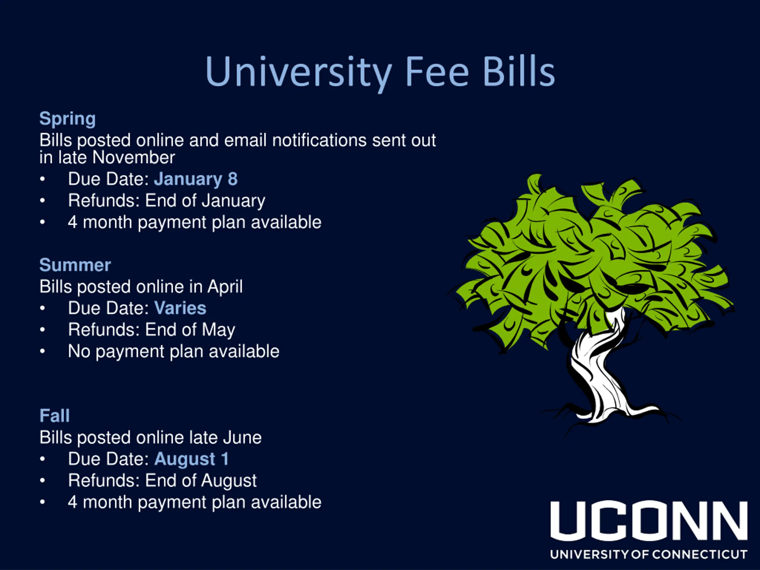 University Fee Bills Spring Bills posted online and email notifications sent out in late November Due Date: January 8 Refunds: End of January 4 month payment plan available Summer Bills posted online in April Due Date: Varies Refunds: End of May No payment plan available Fall Bills posted online late June Due Date: August 1 Refunds: End of August 4 month payment plan available