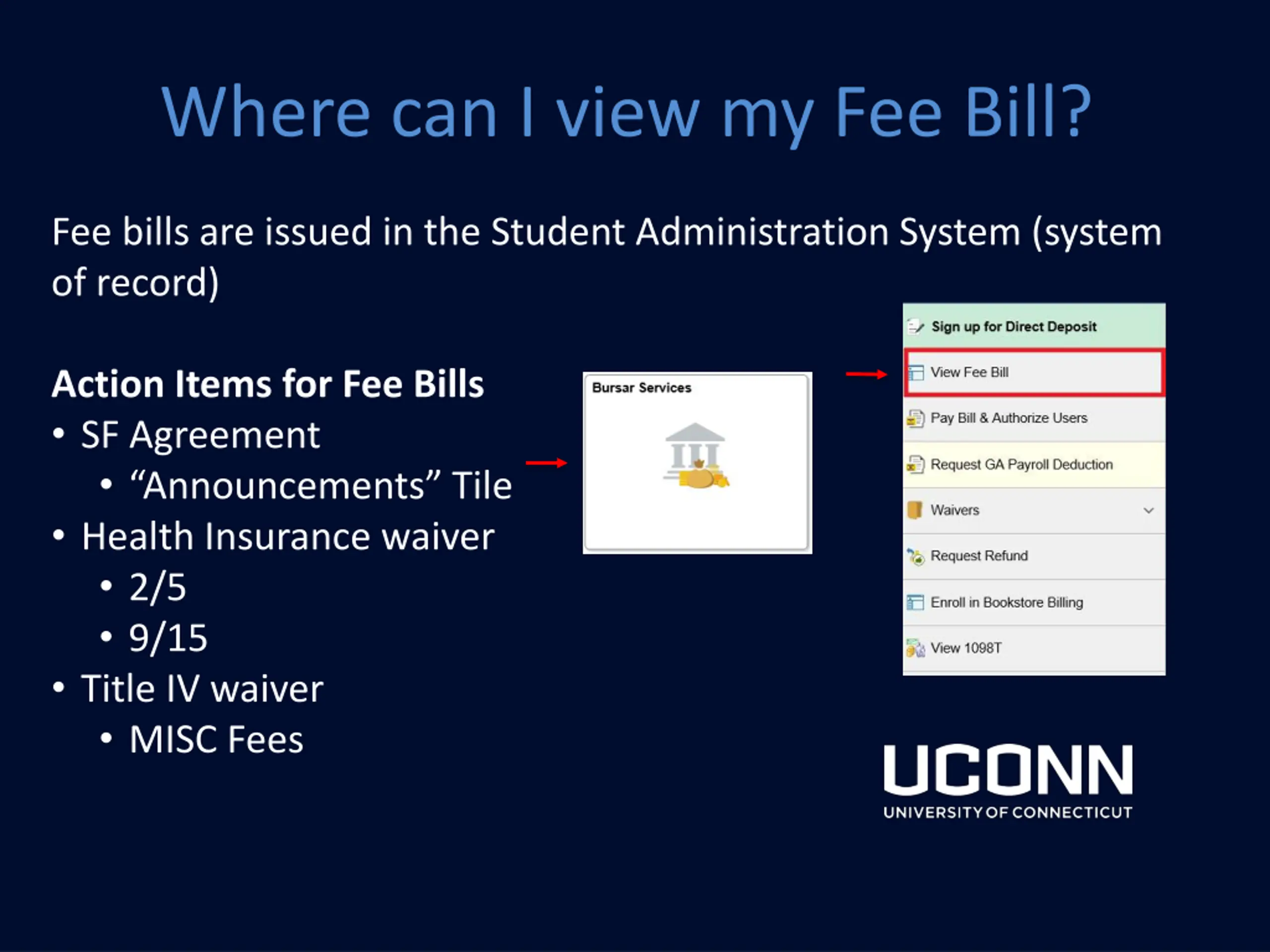 Where can I view my Fee Bill? Fee bills are issued in the Student Administration System (system of record) Action Items for Fee Bills SF Agreement Announcements Tile Health Insurance waiver 2/5 9/15 Title IV waiver MISC Fees