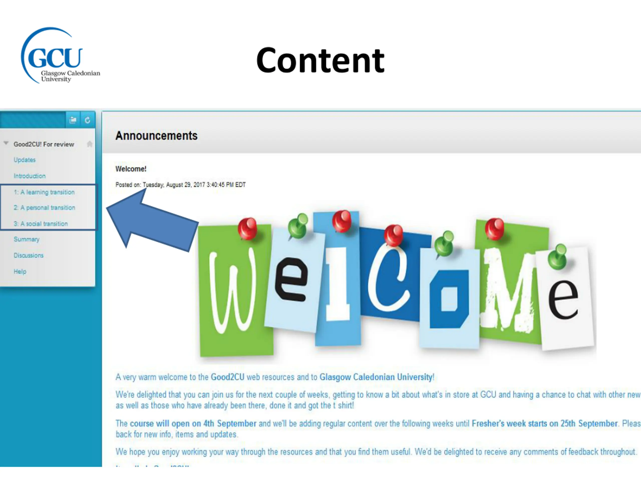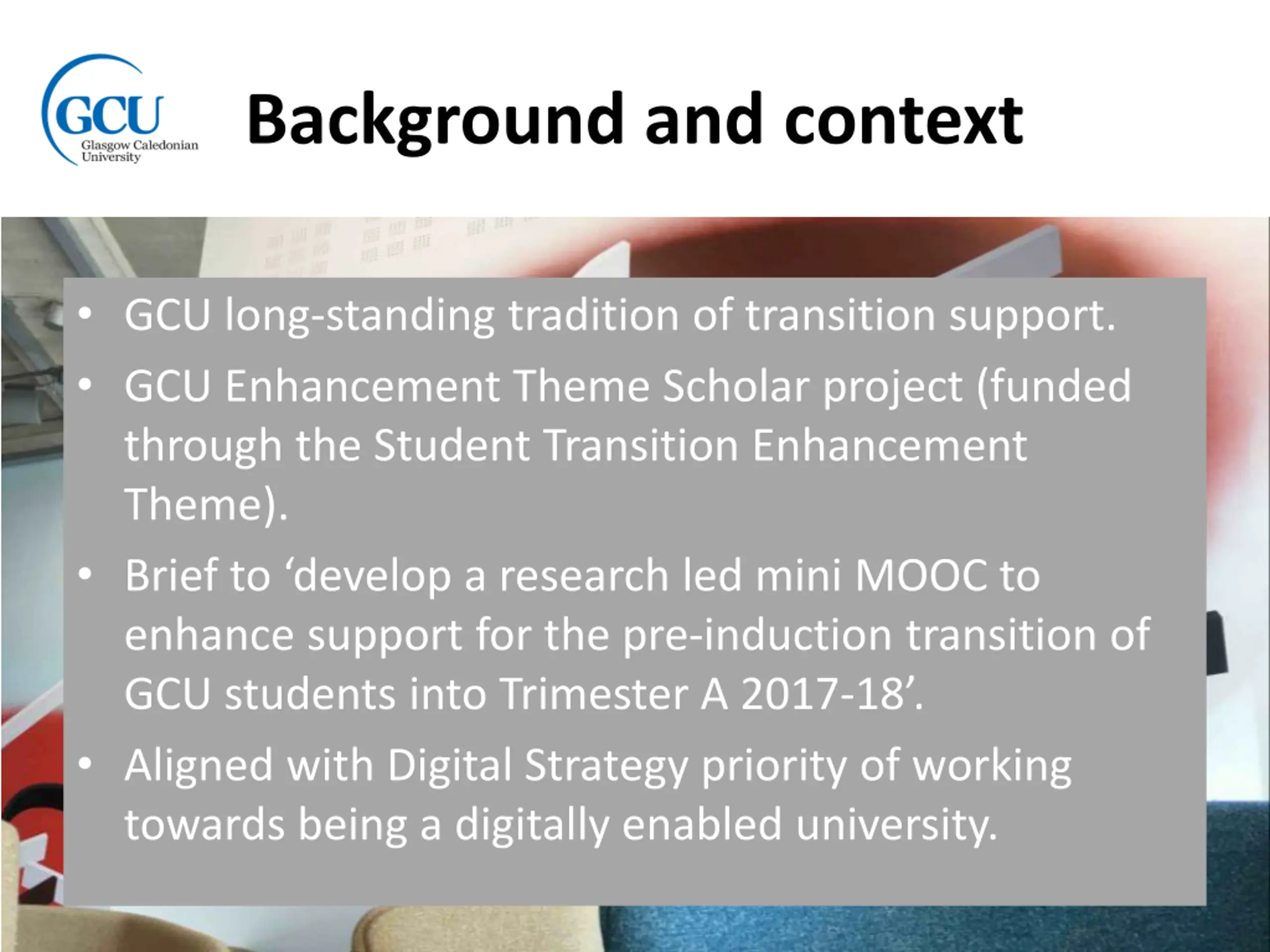 Background and context GCU long-standing tradition of transition support. GCU Enhancement Theme Scholar project (funded through the Student Transition Enhancement Theme). Brief to develop a research led mini MOOC to enhance support for the pre-induction transition of GCU students into Trimester A 2017-18 . Aligned with Digital Strategy priority of working towards being a digitally enabled university.