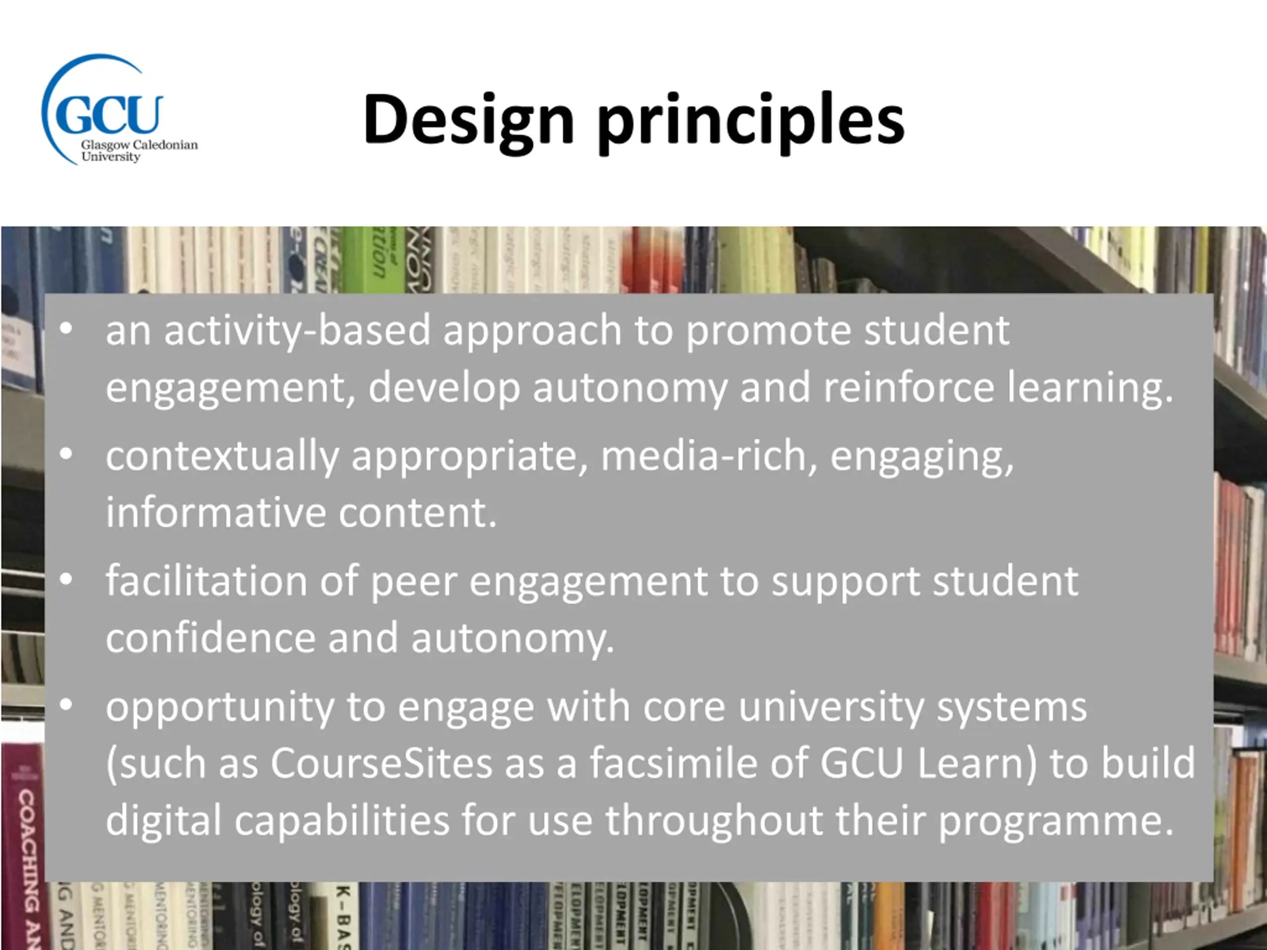 Design principles an activity-based approach to promote student engagement, develop autonomy and reinforce learning. contextually appropriate, media-rich, engaging, informative content. facilitation of peer engagement to support student confidence and autonomy. opportunity to engage with core university systems (such as CourseSites as a facsimile of GCU Learn) to build digital capabilities for use throughout their programme.