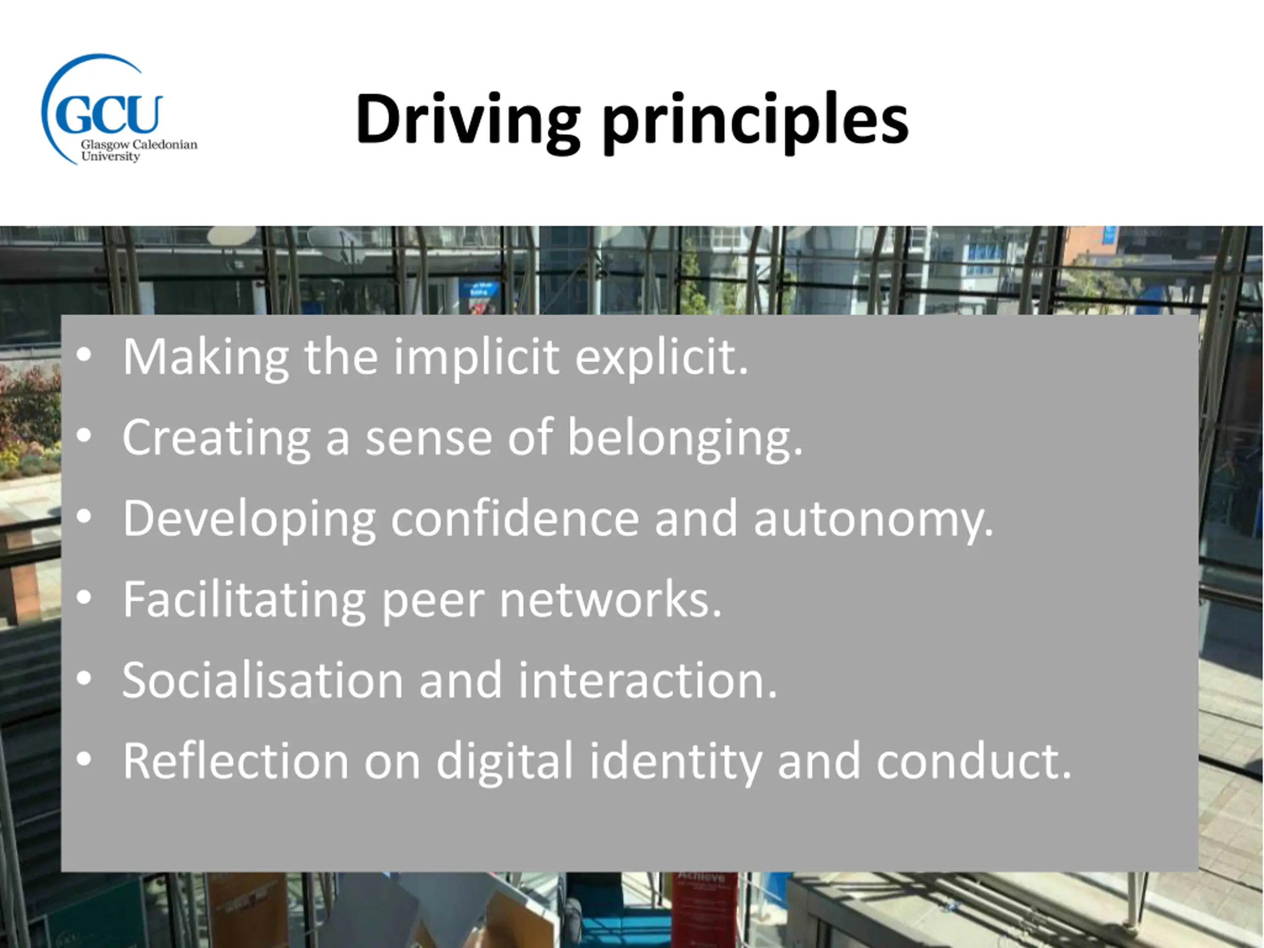 Driving principles Making the implicit explicit. Creating a sense of belonging. Developing confidence and autonomy. Facilitating peer networks. Socialisation and interaction. Reflection on digital identity and conduct.