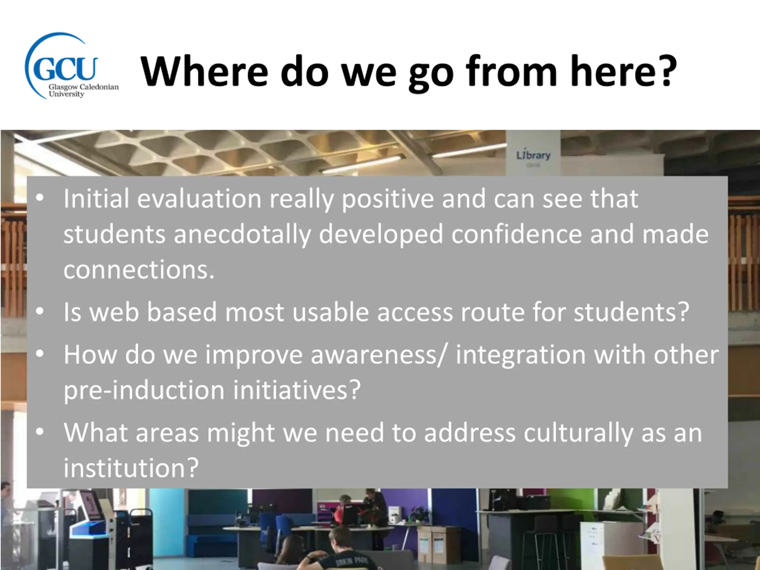 Where do we go from here? Initial evaluation really positive and can see that students anecdotally developed confidence and made connections. Is web based most usable access route for students? How do we improve awareness/ integration with other pre-induction initiatives? What areas might we need to address culturally as an institution?