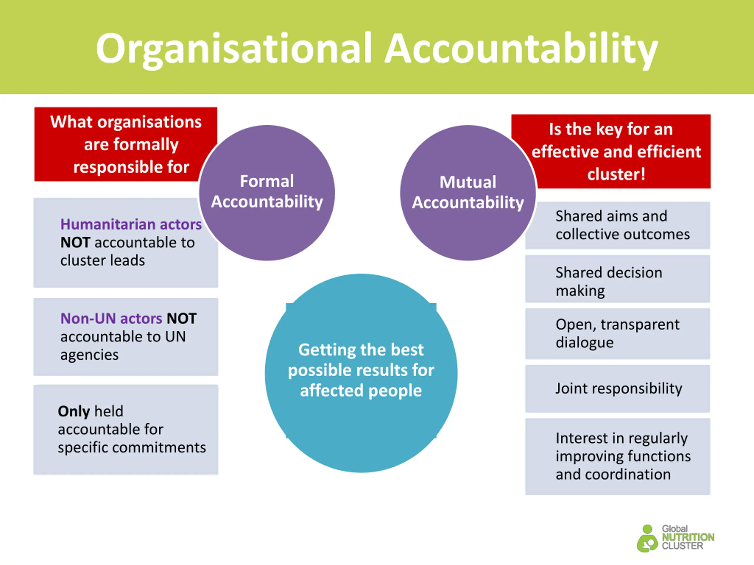 Organisational Accountability What organisations are formally responsible for Is the key for an effective and efficient cluster! Formal Accountability Mutual Accountability Shared aims and collective outcomes Humanitarian actors NOT accountable to cluster leads Shared decision making Non-UN actors NOT accountable to UN agencies Open, transparent dialogue Getting the best possible results for affected people Joint responsibility Only held accountable for specific commitments Interest in regularly improving functions and coordination