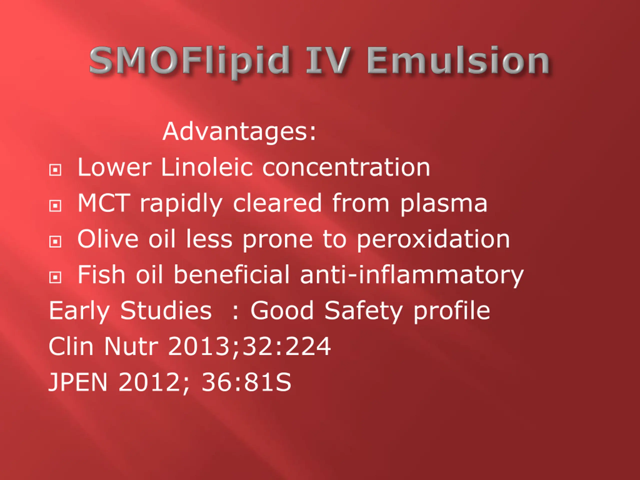 Advantages: Lower Linoleic concentration MCT rapidly cleared from plasma Olive oil less prone to peroxidation Fish oil beneficial anti-inflammatory Early Studies : Good Safety profile Clin Nutr 2013;32:224 JPEN 2012; 36:81S