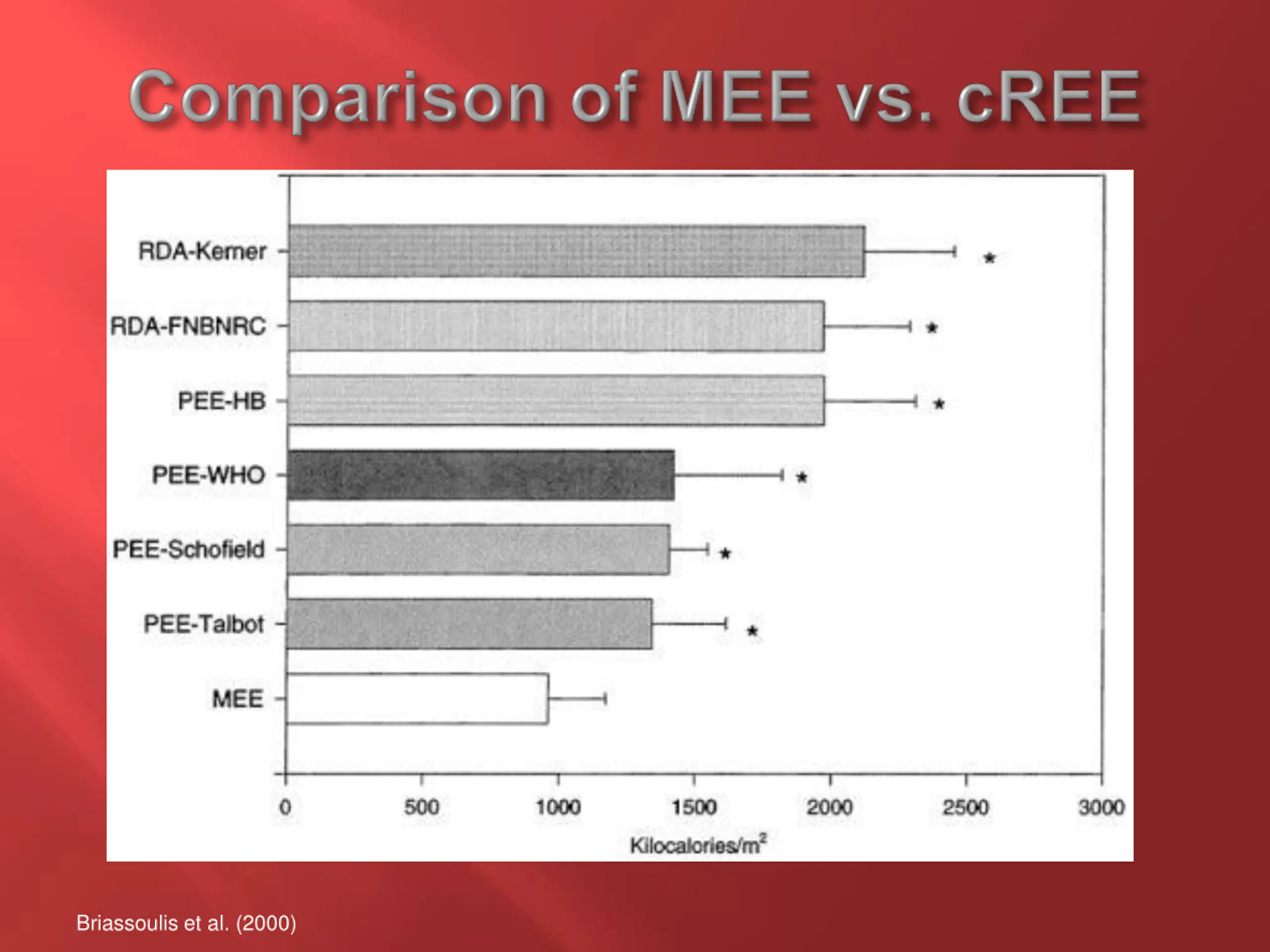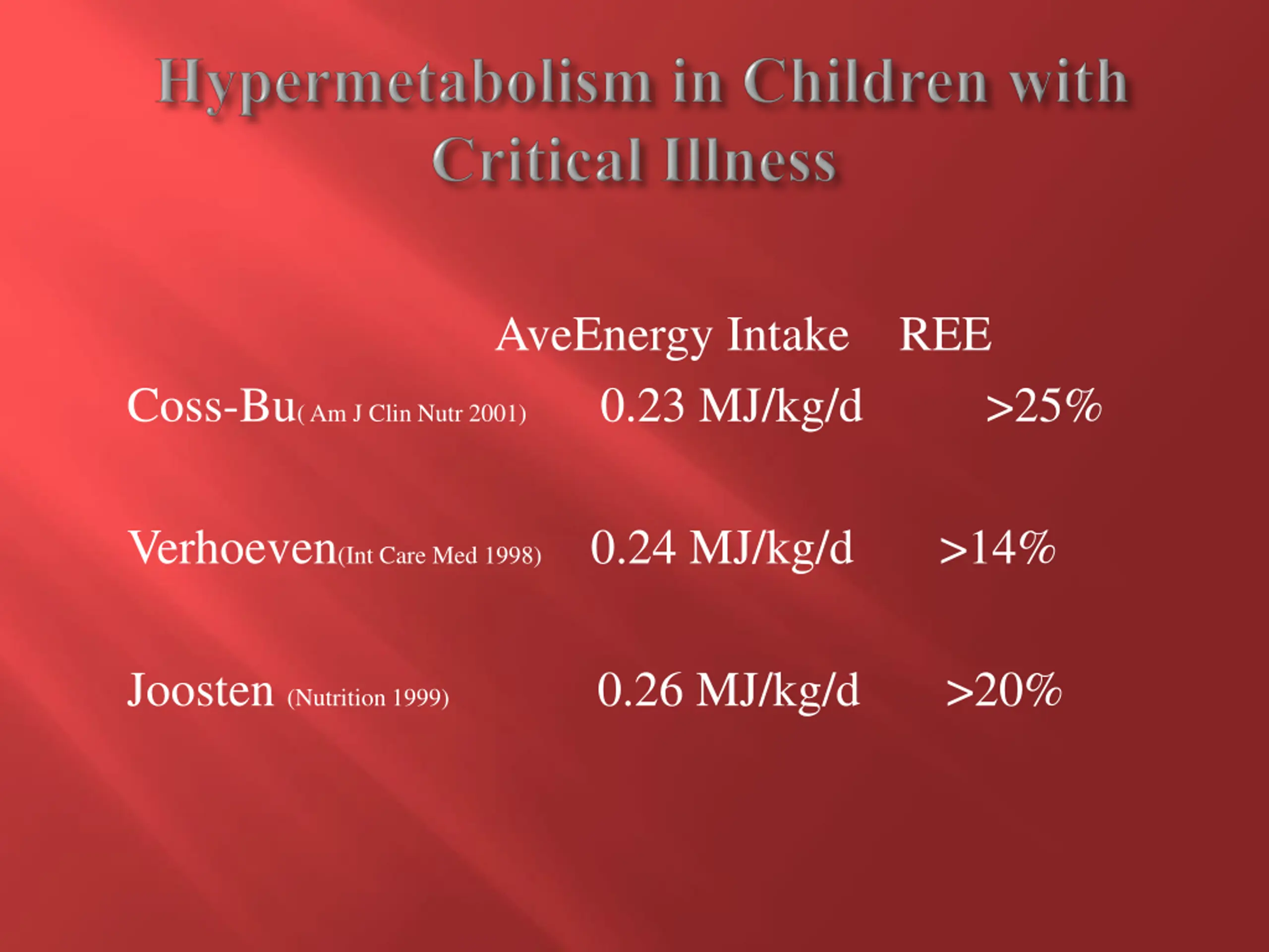 AveEnergy Intake REE Coss-Bu( Am J Clin Nutr 2001) 0.23 MJ/kg/d >25% Verhoeven(Int Care Med 1998) 0.24 MJ/kg/d >14% Joosten (Nutrition 1999) 0.26 MJ/kg/d >20%