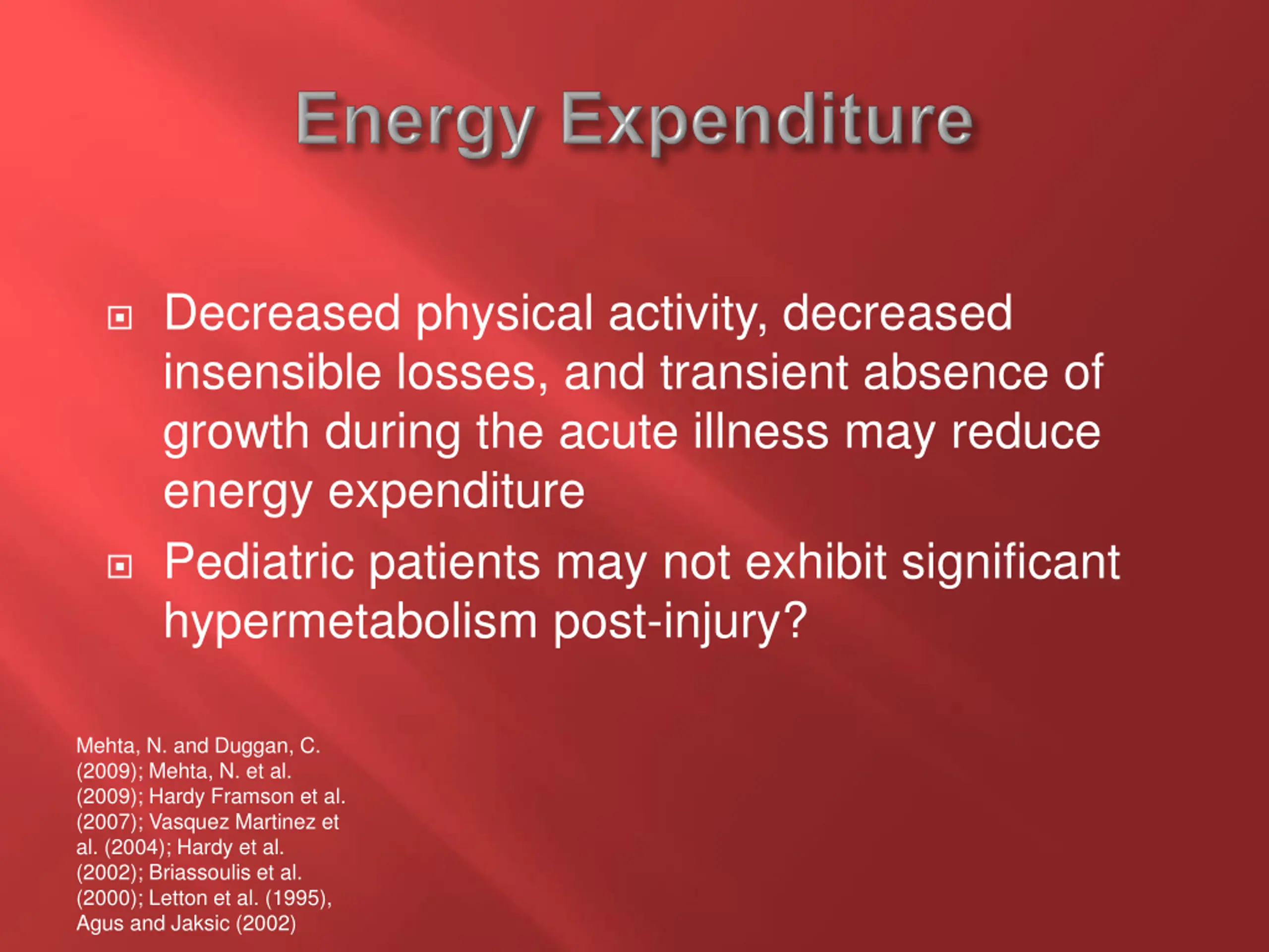 Decreased physical activity, decreased insensible losses, and transient absence of growth during the acute illness may reduce energy expenditure Pediatric patients may not exhibit significant hypermetabolism post-injury? Mehta, N. and Duggan, C. (2009); Mehta, N. et al. (2009); Hardy Framson et al. (2007); Vasquez Martinez et al. (2004); Hardy et al. (2002); Briassoulis et al. (2000); Letton et al. (1995), Agus and Jaksic (2002)