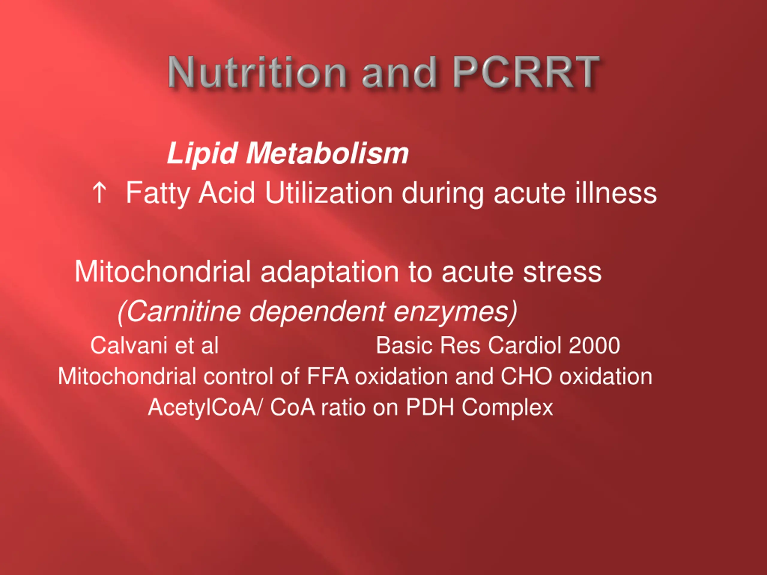 Lipid Metabolism Fatty Acid Utilization during acute illness Mitochondrial adaptation to acute stress (Carnitine dependent enzymes) Calvani et al Basic Res Cardiol 2000 Mitochondrial control of FFA oxidation and CHO oxidation AcetylCoA/ CoA ratio on PDH Complex