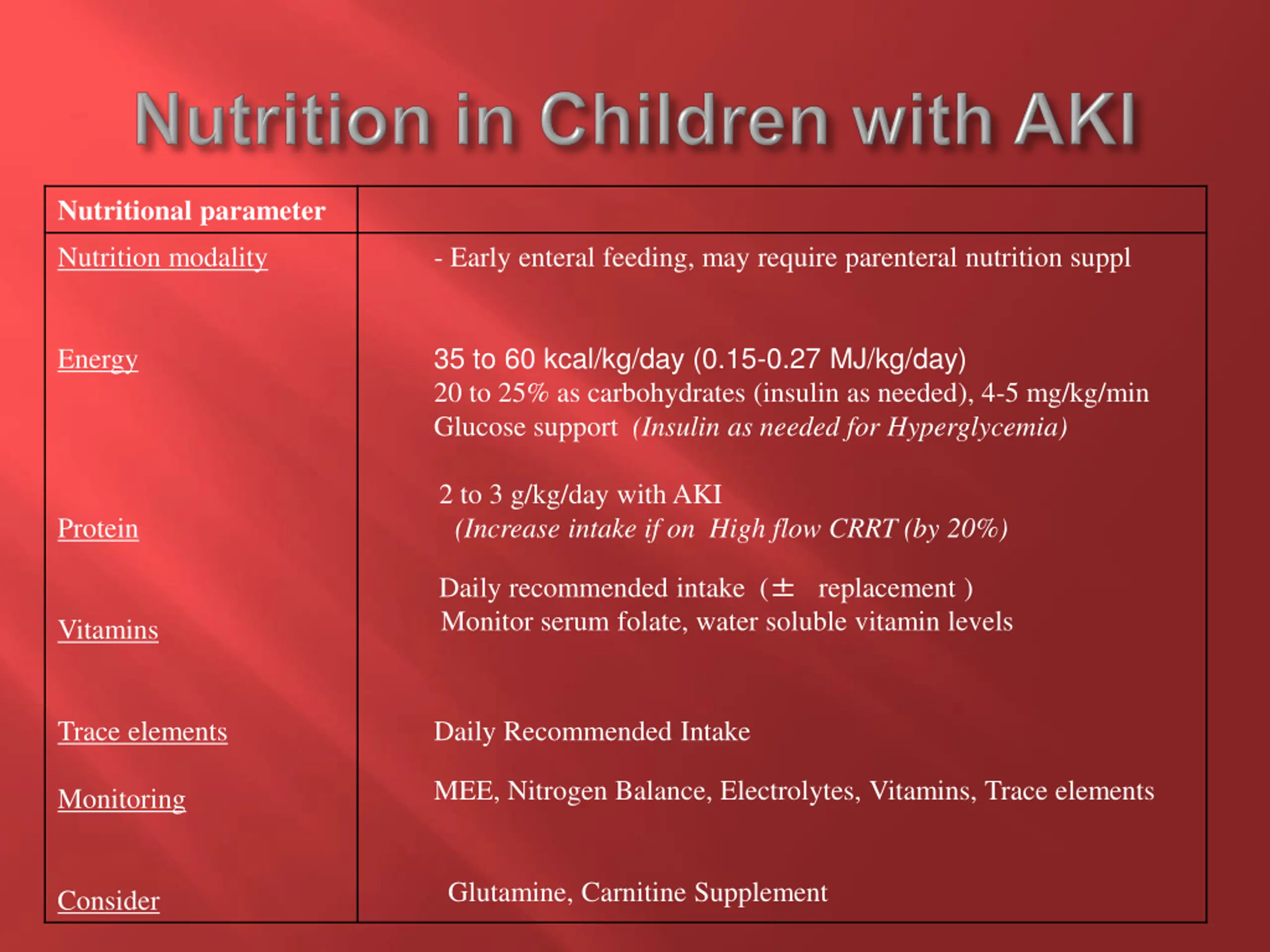 Nutritional parameter Nutrition modality - Early enteral feeding, may require parenteral nutrition suppl 35 to 60 kcal/kg/day (0.15-0.27 MJ/kg/day) 20 to 25% as carbohydrates (insulin as needed), 4-5 mg/kg/min Glucose support (Insulin as needed for Hyperglycemia) Energy 2 to 3 g/kg/day with AKI (Increase intake if on High flow CRRT (by 20%) Protein Daily recommended intake ( replacement ) Monitor serum folate, water soluble vitamin levels Vitamins Trace elements Daily Recommended Intake MEE, Nitrogen Balance, Electrolytes, Vitamins, Trace elements Monitoring Glutamine, Carnitine Supplement Consider