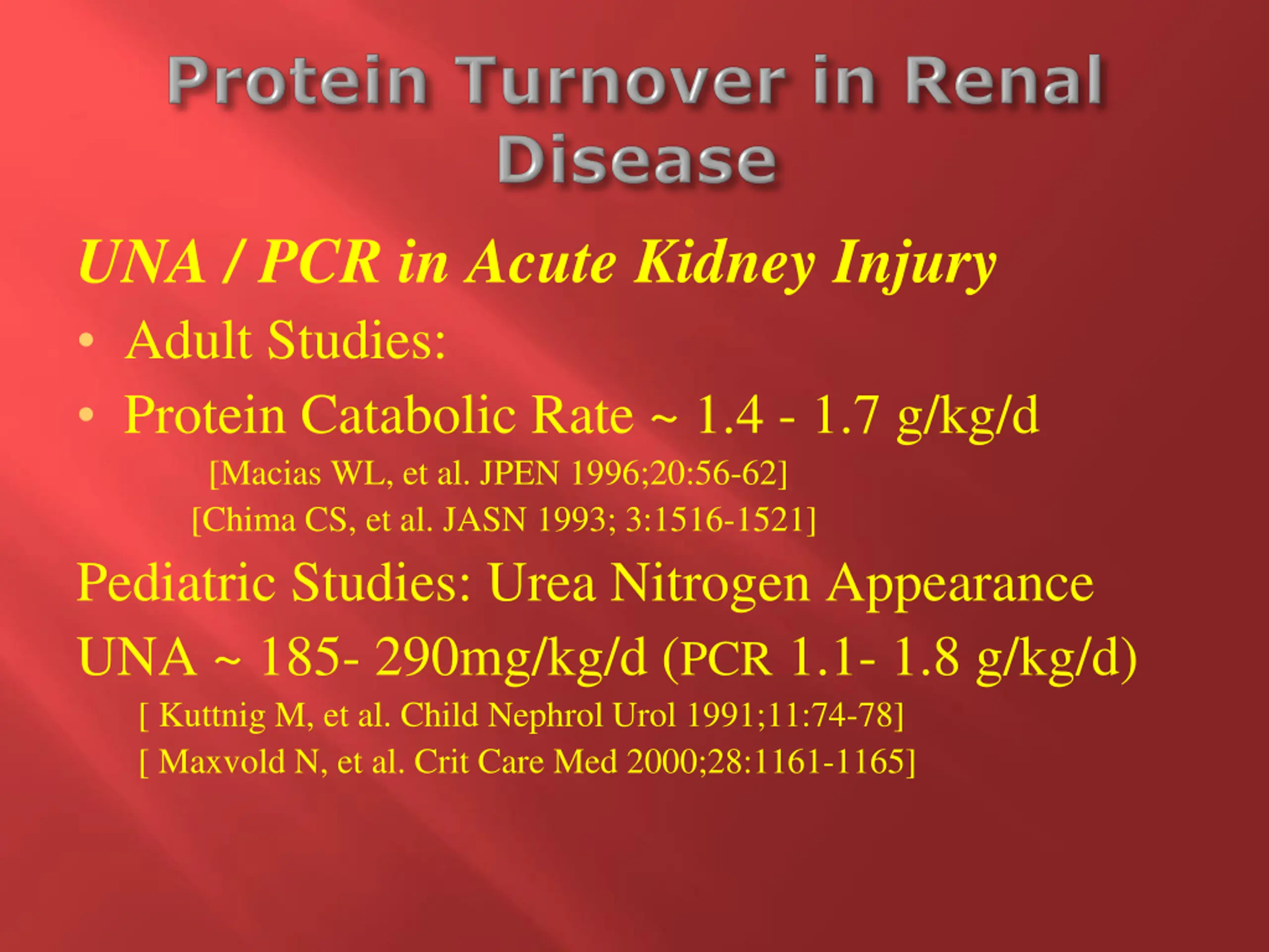 UNA / PCR in Acute Kidney Injury Adult Studies: Protein Catabolic Rate ~ 1.4 - 1.7 g/kg/d [Macias WL, et al. JPEN 1996;20:56-62] [Chima CS, et al. JASN 1993; 3:1516-1521] Pediatric Studies: Urea Nitrogen Appearance UNA ~ 185- 290mg/kg/d (PCR 1.1- 1.8 g/kg/d) [ Kuttnig M, et al. Child Nephrol Urol 1991;11:74-78] [ Maxvold N, et al. Crit Care Med 2000;28:1161-1165]