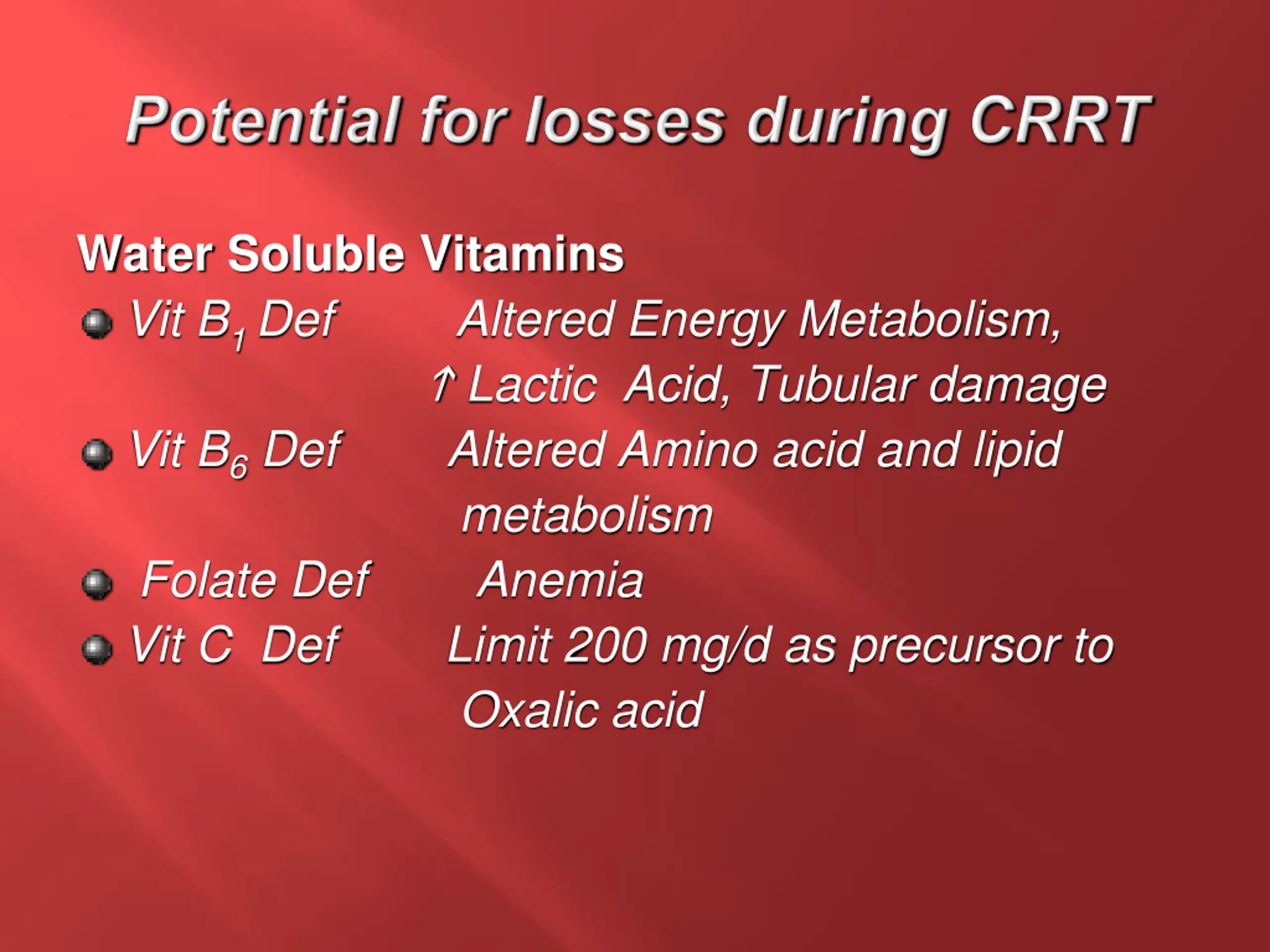Water Soluble Vitamins Vit B1 Def Altered Energy Metabolism, Lactic Acid, Tubular damage Vit B6 Def Altered Amino acid and lipid metabolism Folate Def Anemia Vit C Def Limit 200 mg/d as precursor to Oxalic acid